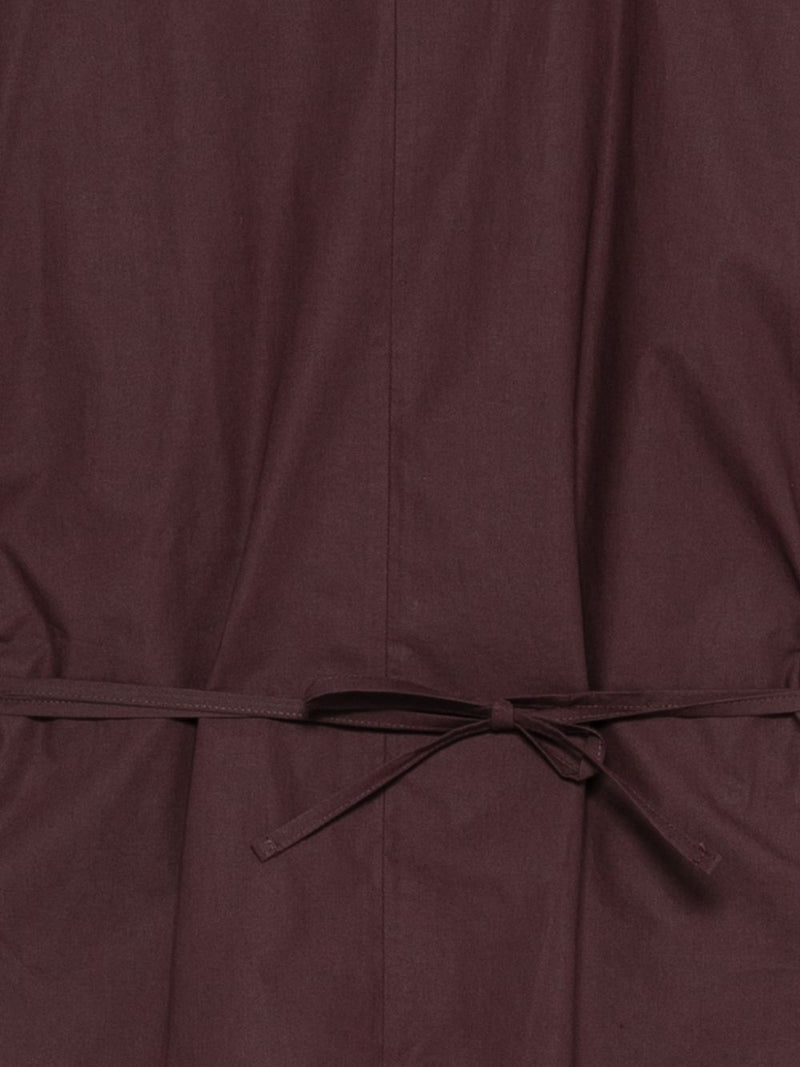 Il capo gioca magistralmente con i volumi: le maniche larghe donano un movimento sofisticato e contemporaneo, mentre lo scollo rotondo pulito conferisce un'estetica minimale e versatile. L'elemento chiave è la cintura annodata in vita, che permette di modulare la silhouette a piacimento, definendo la figura con un tocco femminile e sartoriale.