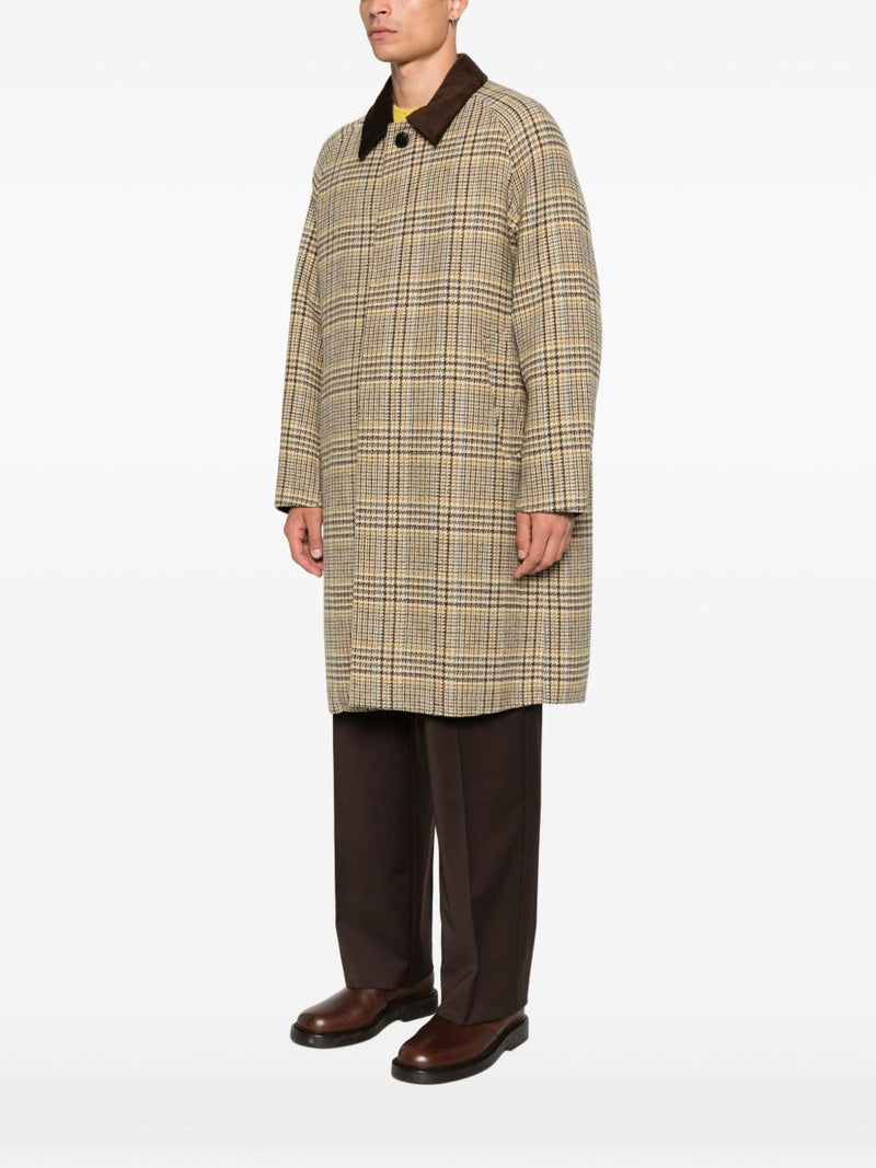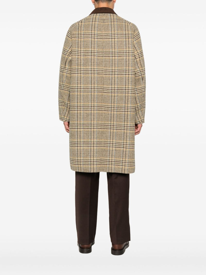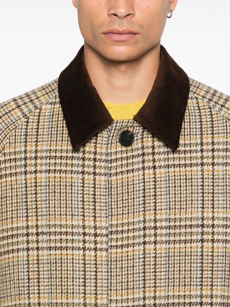 Il marrone è arricchito da un raffinato motivo a quadri, che dona profondità e carattere al design. Il colletto a contrasto aggiunge un dettaglio ricercato, mentre la chiusura frontale con abbottonatura sottolinea l’ispirazione sartoriale del modello. La tasca a filetto laterale garantisce praticità senza alterare la pulizia delle linee, completate dalle maniche lunghe che ne definiscono la silhouette classica.