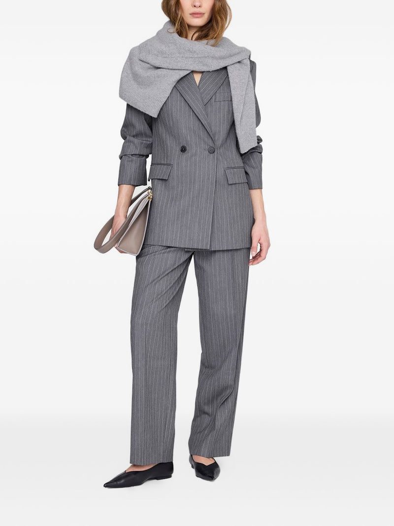 La giacca donna Anine Bing si distingue per il suo design sartoriale in tonalità grigio chiaro, valorizzato da un elegante motivo gessato verticale. Il modello presenta una costruzione doppiopetto con rever classici e tasche a pattina, per un look pulito e contemporaneo.