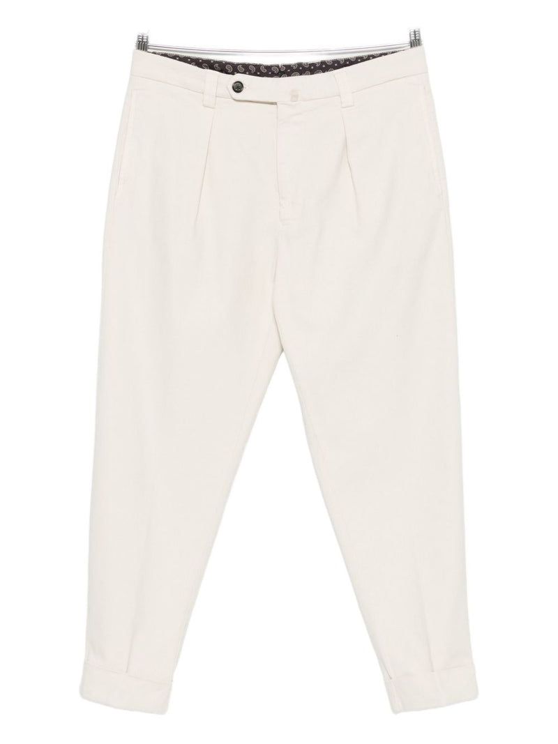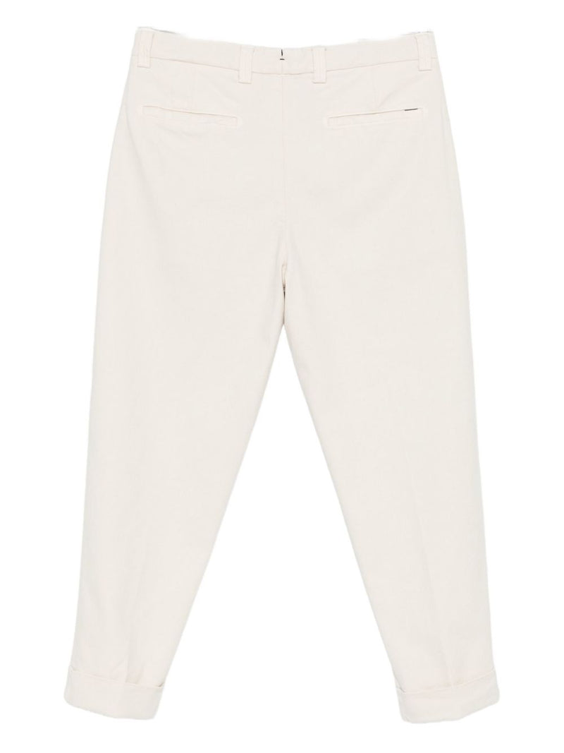 Le pieghe frontali, l’orlo con risvolto e le tasche a filetto sul retro riflettono la tradizione sartoriale del brand, mentre i passanti in vita e la chiusura a bottoni completano un design pulito e ricercato.