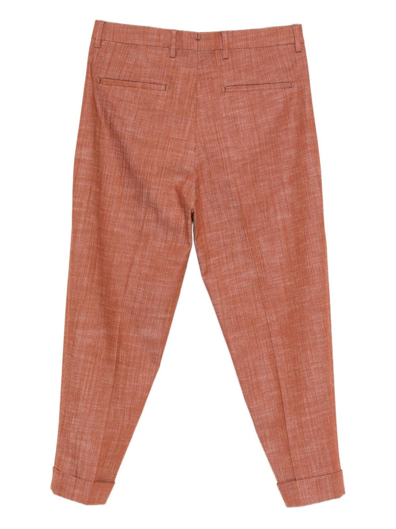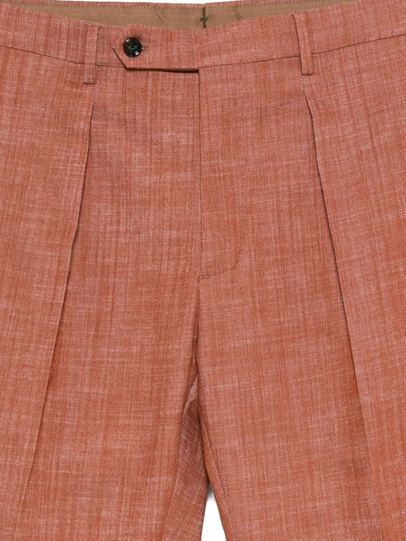 Dieses in einem warmen Tabakton gehaltene Kleid besticht durch eine einzelne Bundfalte vorne , seitliche Eingrifftaschen und Paspeltaschen hinten . Der 5 cm breite Umschlag am Saum verleiht ihm eine elegante und moderne Note und macht es perfekt für lässig-elegante oder formelle Anlässe.