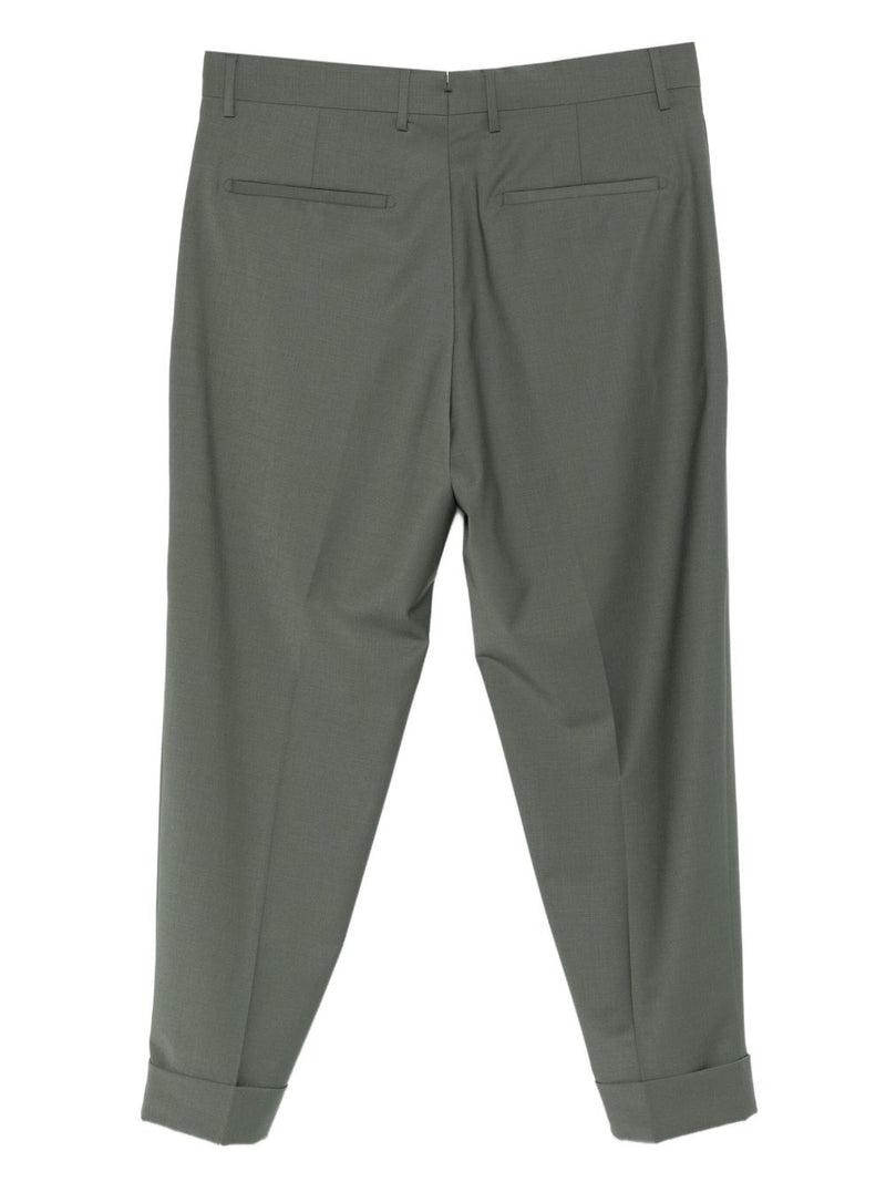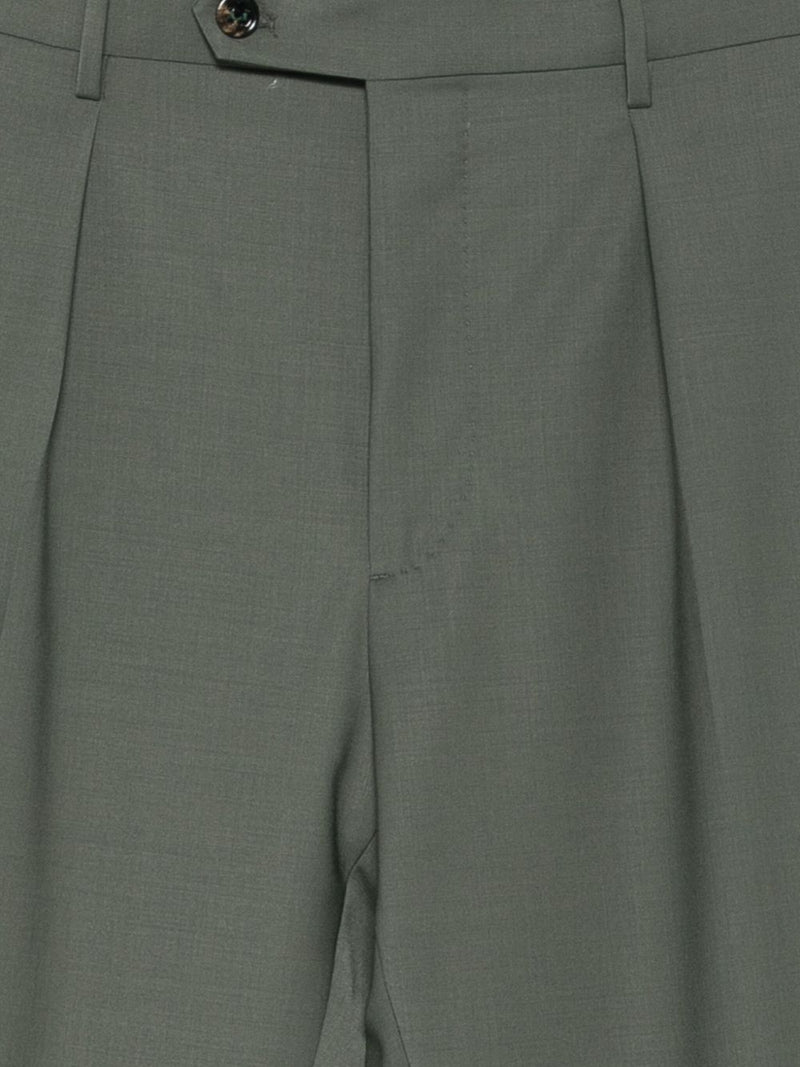 Le pieghe frontali, l’orlo con risvolto e le tasche a filetto sul retro testimoniano la cura sartoriale del brand, mentre la chiusura a bottoni e i passanti in vita completano un design dal fascino discreto e contemporaneo.