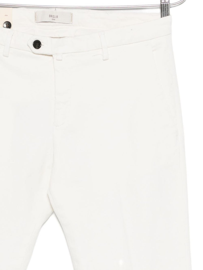 Sie werden in Weiß angeboten und verfügen über einen Hosenschlitz mit Knopfleiste , Gürtelschlaufen und seitlichen Leistentaschen , die dem Modell einen klaren, modernen Look verleihen. Die hervorragende Verarbeitung und Liebe zum Detail machen diese Hose zu einem Symbol des Made in Italy-Stils von Briglia 1949 .