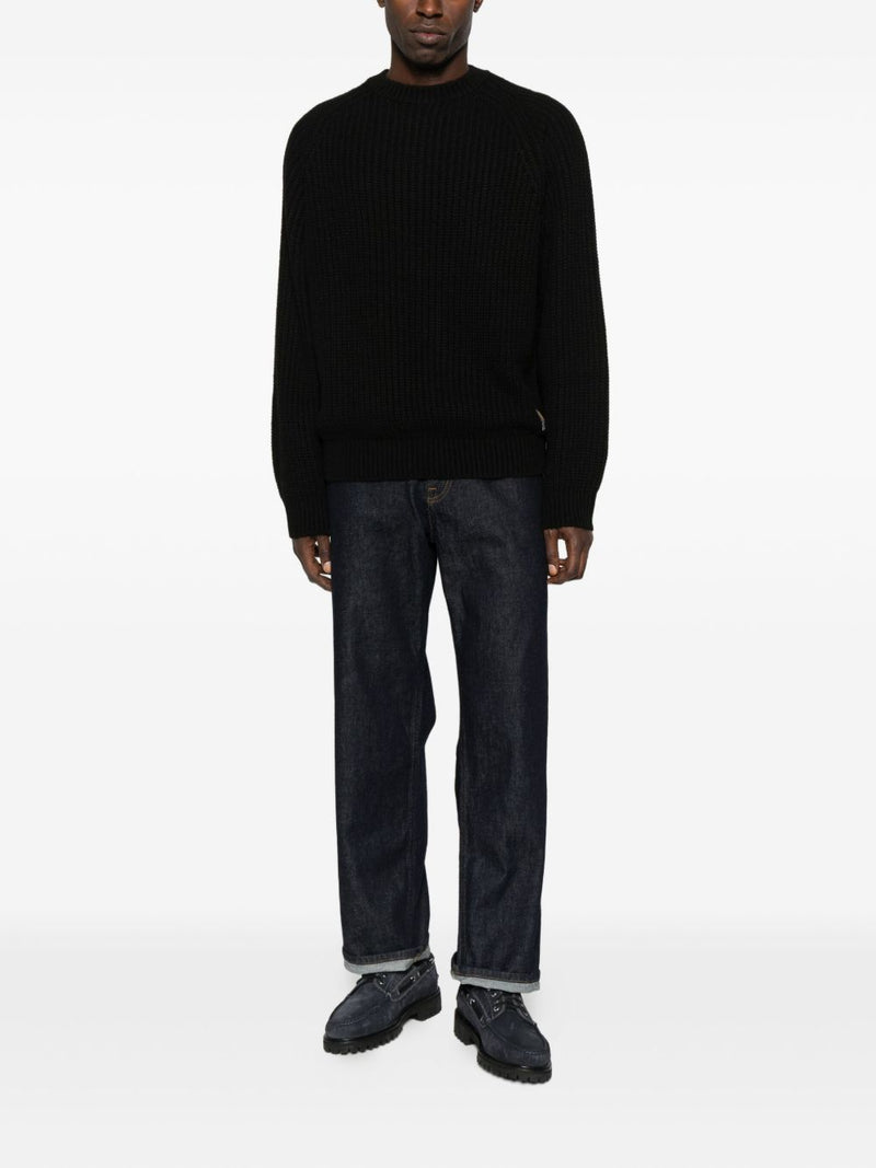 Es wird in Schwarz angeboten und verfügt über einen Rippenstrick , einen klassischen Rundhalsausschnitt , lange Ärmel und einen Logoaufnäher auf der Vorderseite , ein unverwechselbares Markendetail. Das schlichte Design und die strukturierte Textur machen es ideal für lässige, moderne Looks.