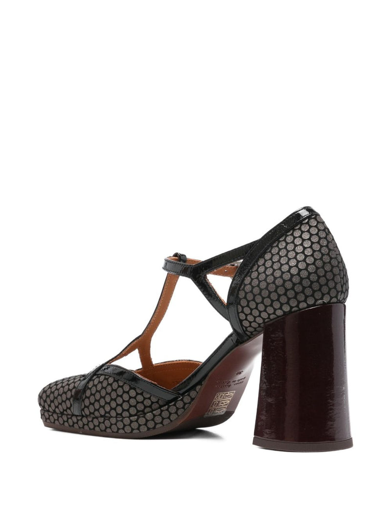 Romantiche e raffinate, le pumps Chie Mihara Amante con tacco largo reinterpretano lo stile rétro con un tocco giocoso e contemporaneo. Realizzate in pelle lucida nera con motivo a pois, si distinguono per il cinturino a T con chiusura a fibbia, che dona stabilità e valorizza la linea del piede.