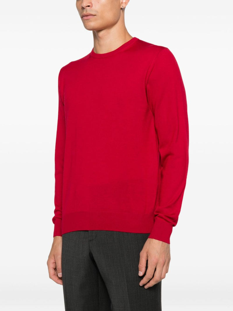 Es wird in Rot angeboten und verfügt über einen Rundhalsausschnitt , lange Ärmel sowie gerippten Saum und Bündchen , die für Komfort und eine klare Linie sorgen. Die Qualität der Materialien und die Liebe zum Detail machen diesen Pullover zu einem Symbol für Dellacianas hervorragende Schneiderkunst.