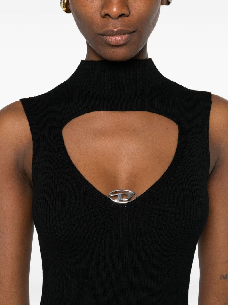 Das schwarze Kleid besticht durch einen hohen Kragen , Cut-out-Details und ein ärmelloses Design für einen sinnlichen und zugleich eleganten Look. Es lässt sich perfekt mit Stiefeln oder Lederjacken kombinieren und ist das ideale Kleid für einen ausdrucksstarken, modernen Stil.
