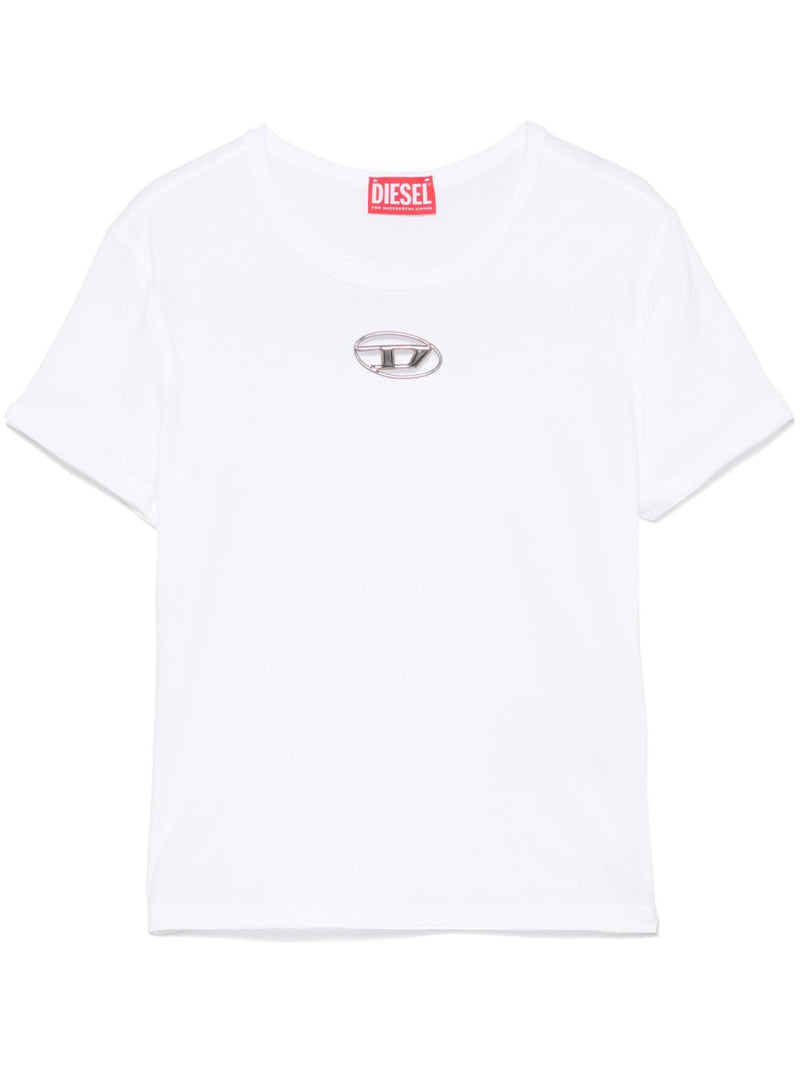 Es ist in Weiß erhältlich und verfügt über einen Rundhalsausschnitt , kurze Ärmel und eine markante ovale „D“-Logoplakette , die dem minimalistischen Design eine ikonische Note verleiht. Ein vielseitiges und auffälliges Stück, ideal zum Abrunden von Freizeit- oder Streetwear-Looks mit der unverwechselbaren Diesel- Einstellung.