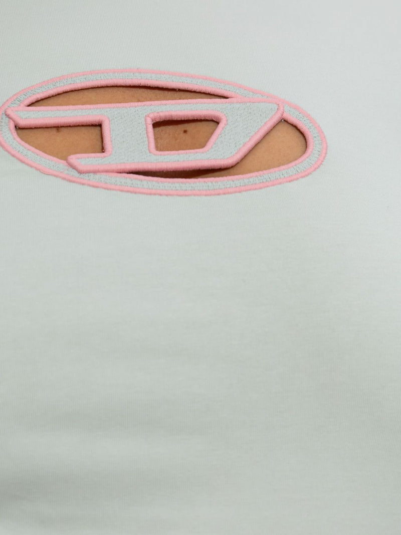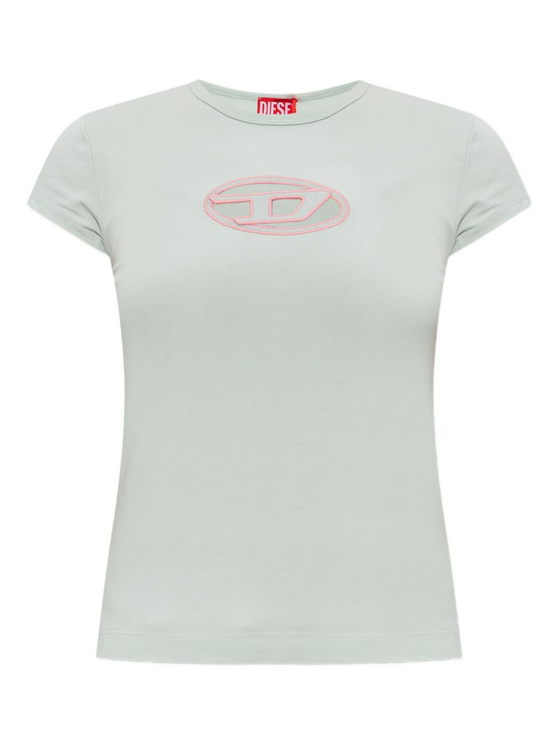 Es wird in Grau angeboten, hat kurze Ärmel , ein Cut-out-Detail , das für eine unverwechselbare Note sorgt, und eine Logo-Stickerei auf der Brust. Dieses T-Shirt ist perfekt für alle, die einen lässigen und dennoch originellen Look lieben und verkörpert den modernen und mutigen Geist von Diesel .