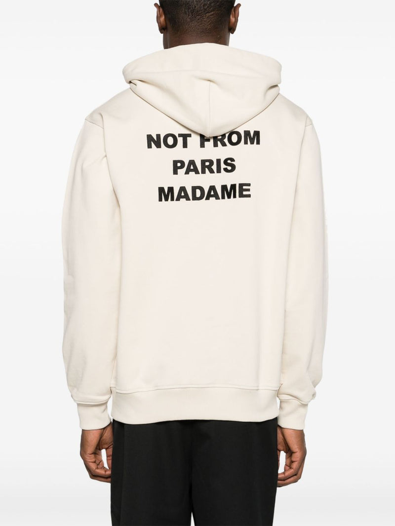 Es wird in Beige angeboten und verfügt über eine große Kapuze mit Kordelzug , lange Ärmel mit überschnittenen Schultern und eine Kängurutasche vorne . Der gerippte Saum und die Bündchen sorgen für eine bequeme Passform, während der Logodruck auf der Brust und das Logo auf dem Rücken eine unverwechselbare und erkennbare Note verleihen, die typisch für die Ästhetik von Drôle De Monsieur ist.