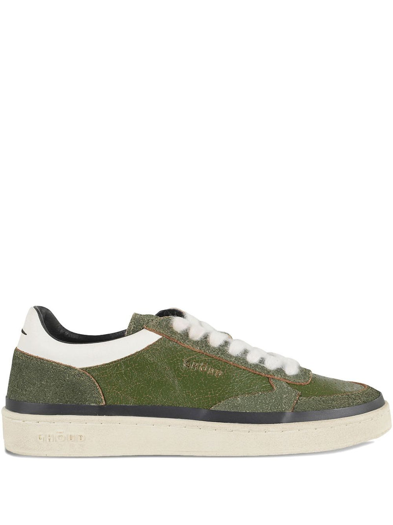 Die Pads GHŌUD Sneaker vereinen modernen Stil mit traditioneller italienischer Handwerkskunst und verkörpern die klare, elegante Ästhetik der venezianischen Marke. Gefertigt aus 100 % Glattleder und Veloursleder , bestechen sie durch ein Einsatzdesign , das den Grünton mit raffinierten Kontrasten und hochwertigen Details hervorhebt.