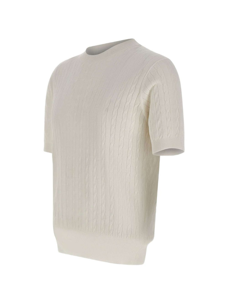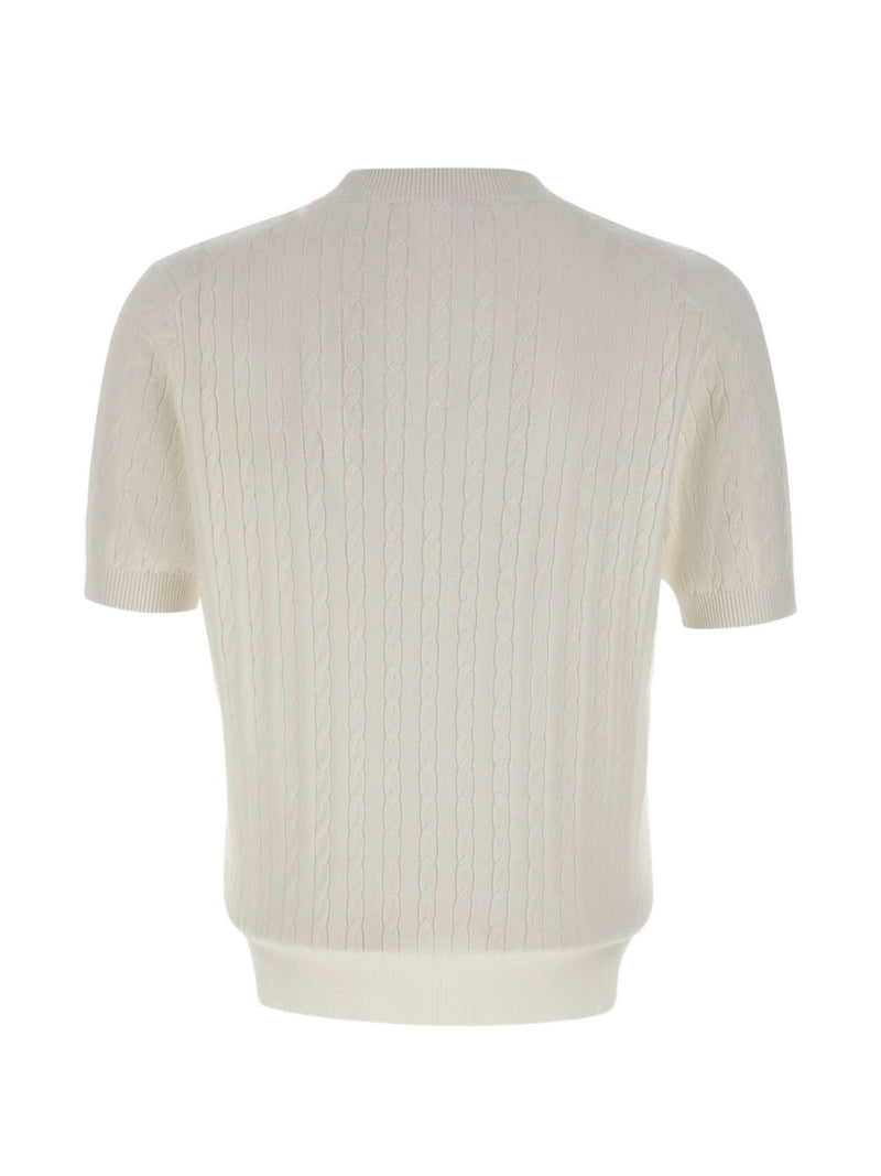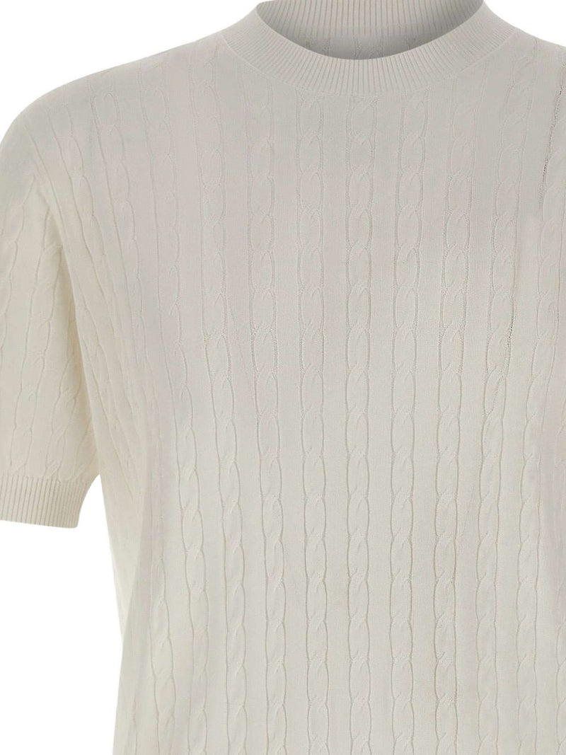 La maglia uomo kangra si distingue per il design essenziale e la lavorazione a treccia sottile che percorre l’intera superficie, valorizzando il modello a maniche corte. Il colore bianco uniforme e il girocollo a costine la rendono una maglia versatile, adatta a completare outfit sia casual che più curati.