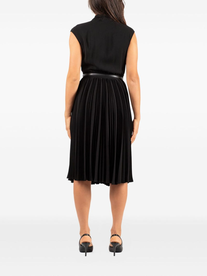 Es wird in Schwarz angeboten und verfügt über ein Crossover-Design mit V-Ausschnitt , einer durch einen passenden Gürtel betonten Taille und einem Faltenrock , der der Silhouette Bewegung und Harmonie verleiht.