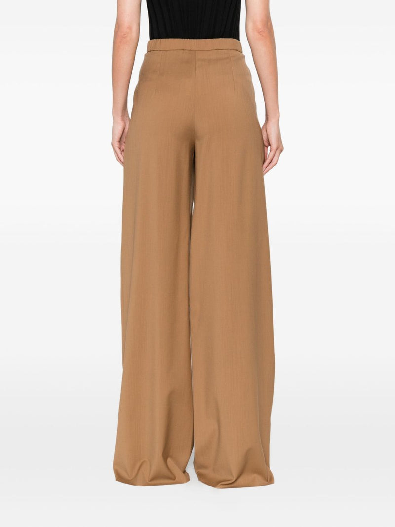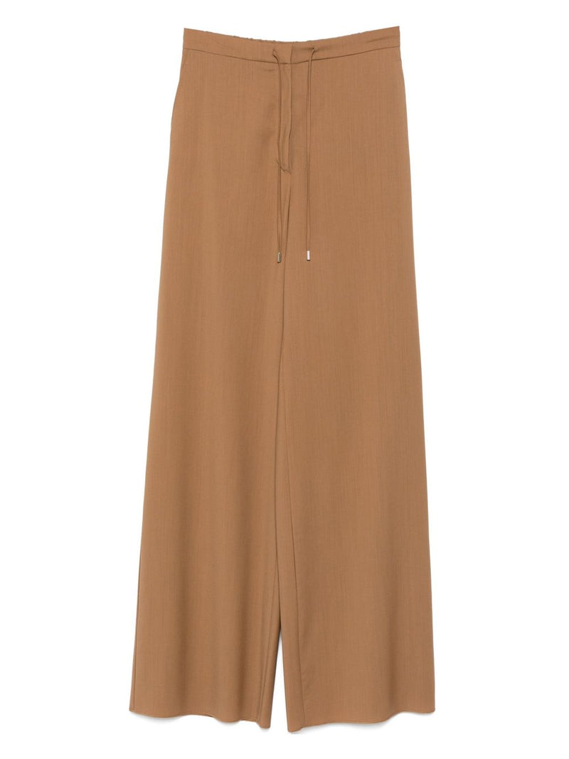Sie sind in Braun erhältlich und verfügen über eine hohe Taille mit Kordelzugverschluss und einen geraden Saum für einen raffinierten und dennoch lässigen Look. Das schlichte Design und die Qualität des Stoffes machen sie zu einem vielseitigen Modell, ideal für lässig-schicke Outfits oder zur Interpretation der für Max Mara typischen entspannten Eleganz.