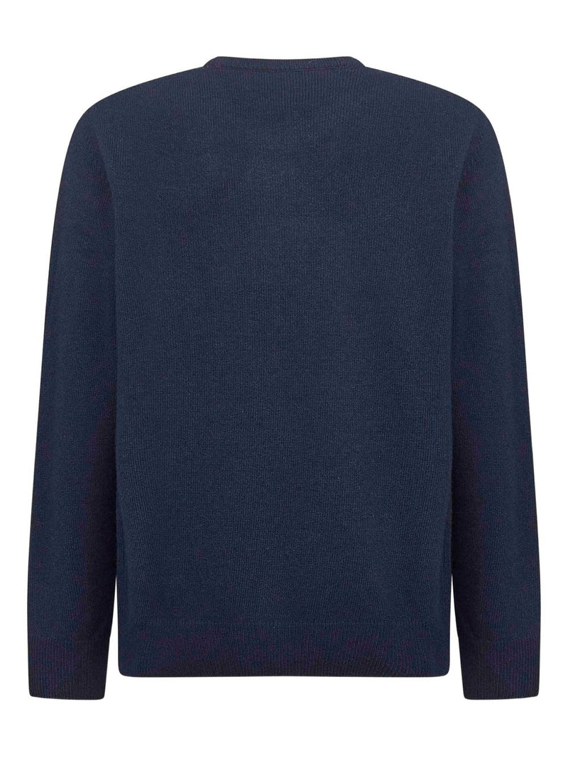 Realizzato in una morbida miscela di lana (35%), viscosa (30%), cashmere (20%) e poliammide (15%), offre calore, comfort e una texture piacevole sulla pelle, perfetta per la stagione invernale. La tonalità blu, elegante e versatile, valorizza la grafica jacquard, mentre il girocollo, gli orli a coste e l’orlo a coste definiscono una silhouette classica e avvolgente.