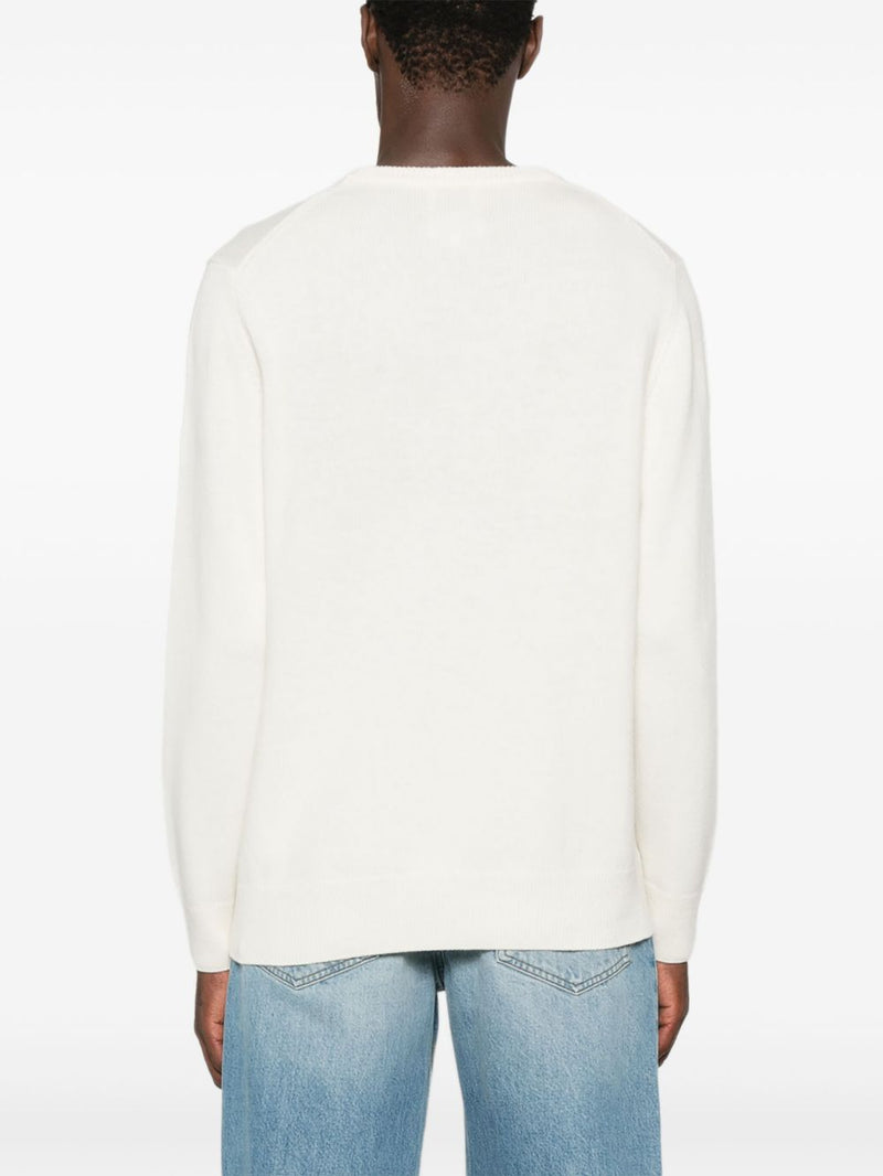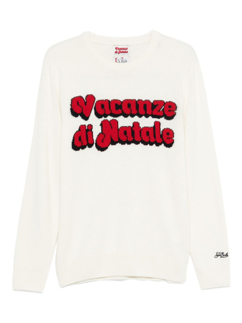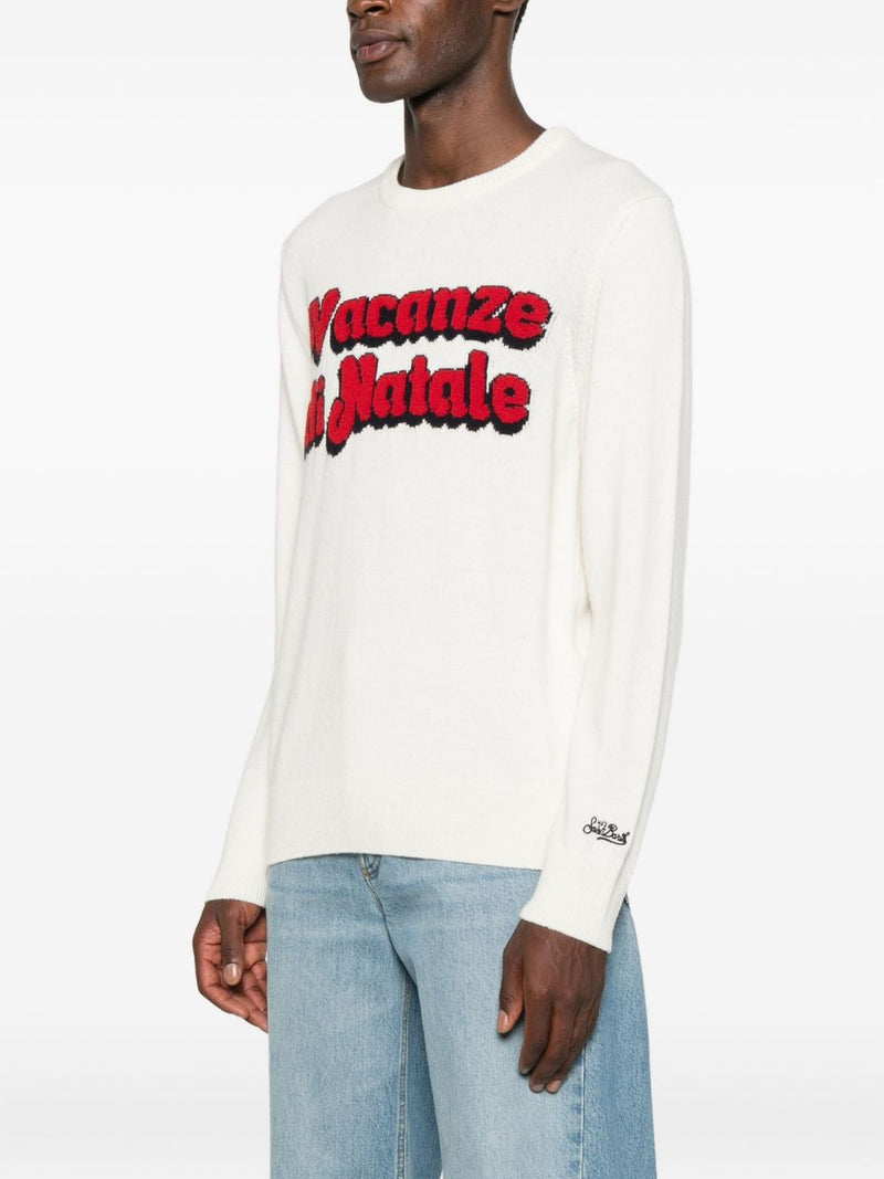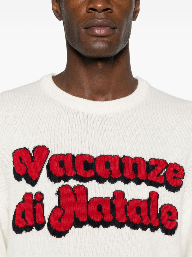 La tonalità bianca mette in risalto il dettaglio ricamato, elemento distintivo che richiama l’ironia e lo stile playful delle celebri capsule natalizie del brand. Il design presenta girocollo, maniche lunghe e una costruzione pulita, perfetta per outfit casual chic o come maglione protagonista nei giorni di festa.