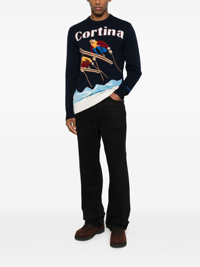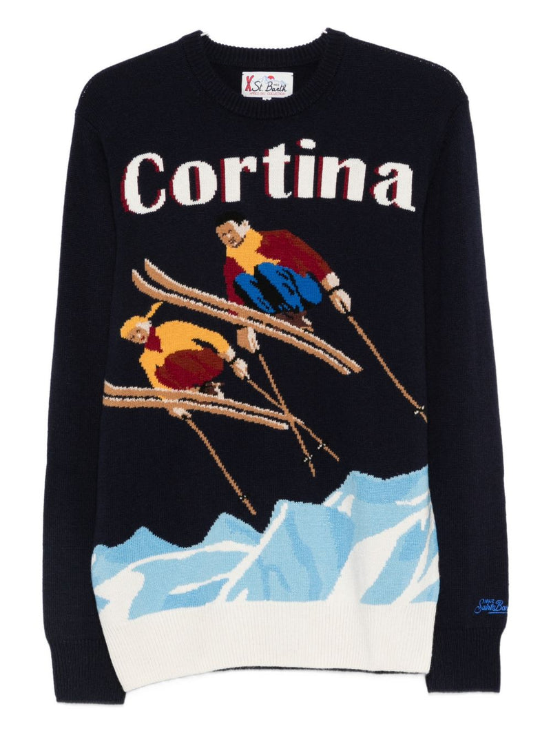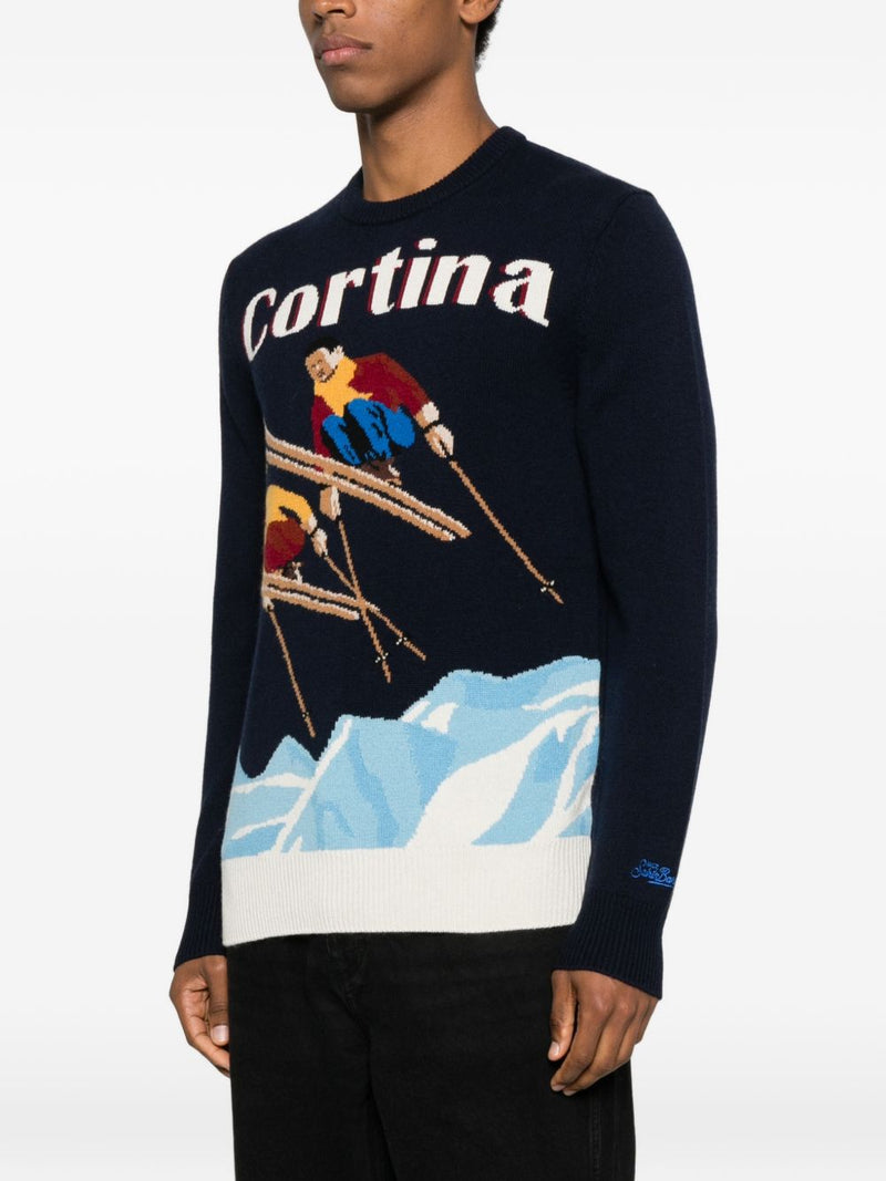 Il maglione Cortina con sciatori di MC2 Saint Barth celebra l’inconfondibile immaginario invernale del brand con un design giocoso e raffinato. La lavorazione jacquard raffigura iconici sciatori, un dettaglio che richiama l’atmosfera delle località alpine e lo spirito delle festività.