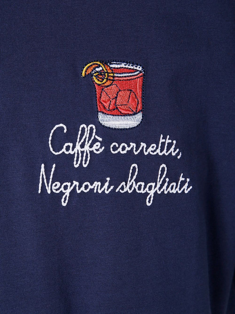 - Modello: T-shirt in cotone con ricamo “Caffè corretti, Negroni sbagliati”