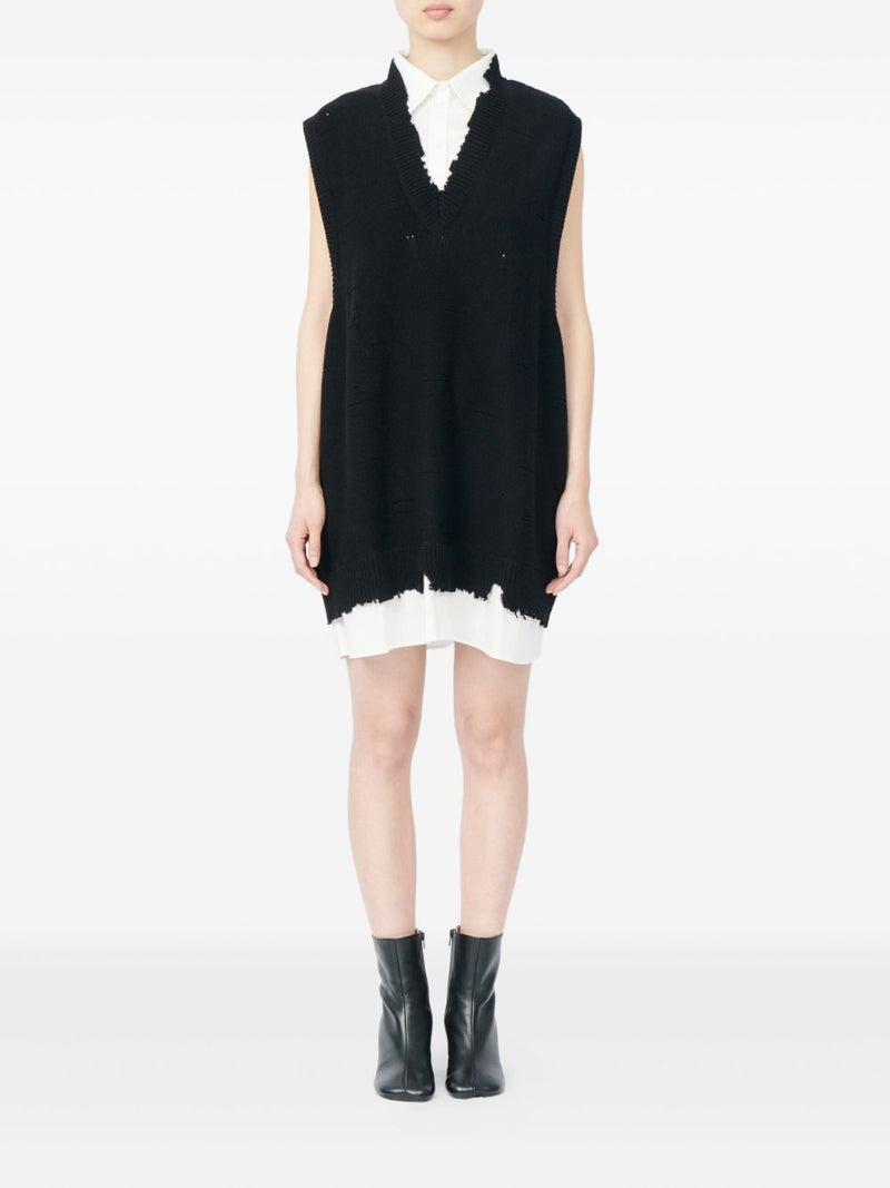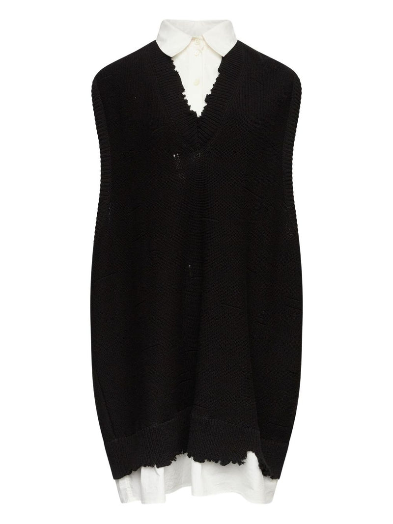 Il design senza maniche valorizza la silhouette, mentre i dettagli sfilacciati e le frange aggiungono un tocco raw e distintivo, perfettamente in linea con l’estetica sperimentale del brand. Realizzato in cotone 100%, garantisce comfort e leggerezza per un look deciso ma versatile.