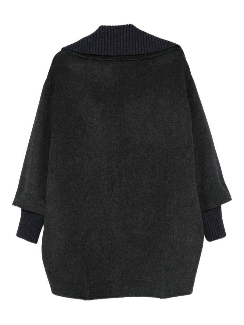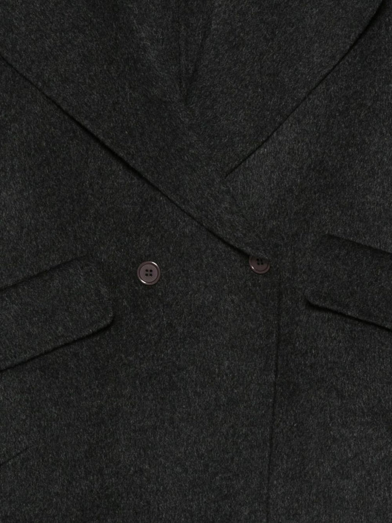 Es wird in Schwarz angeboten und verfügt über breite Revers , einen zweireihigen Frontverschluss mit Knöpfen und seitliche Pattentaschen – Details, die an die Tradition der italienischen Schneiderei erinnern. Die langen Ärmel vervollständigen einen eleganten Look, ideal für formelle Anlässe oder um einem Alltagsoutfit Charakter zu verleihen.