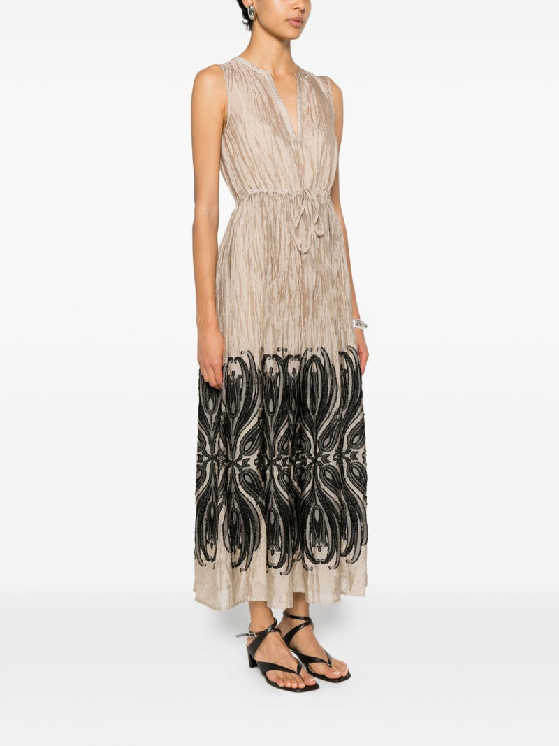 L’abito beige Psophia esprime uno stile raffinato grazie alla linea ampia e alla costruzione senza maniche, valorizzata dallo scollo a V. Il punto vita leggermente segnato con laccetto dona movimento al modello, mantenendo una vestibilità fluida e confortevole.