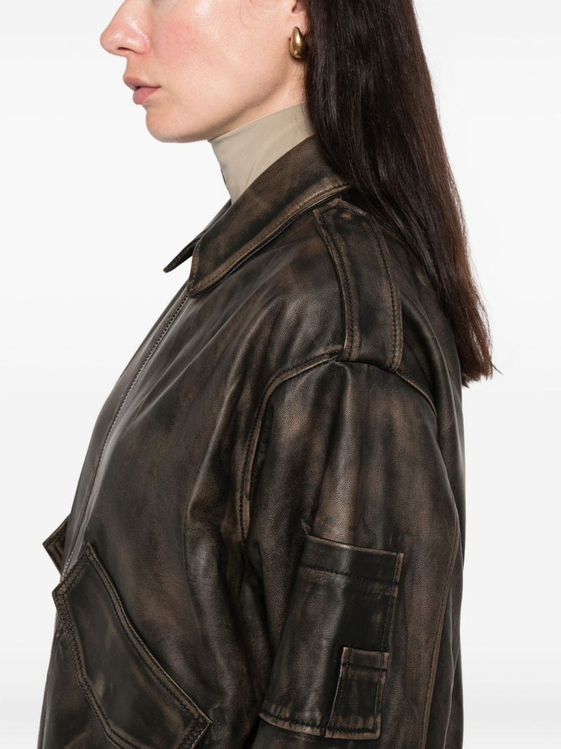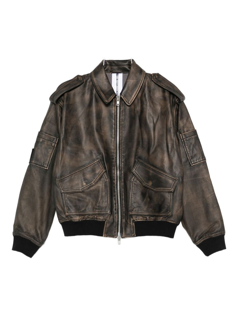 Iconica e senza tempo, la giacca in pelle con zip S.W.O.R.D 6.6.44 è un capo dal carattere deciso, pensato per chi ama distinguersi con stile autentico. Realizzata in pelle di vitello 100% nel colore marrone e nero, unisce lavorazione artigianale e dettagli contemporanei in un design ispirato al classico bomber.