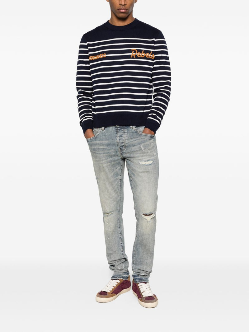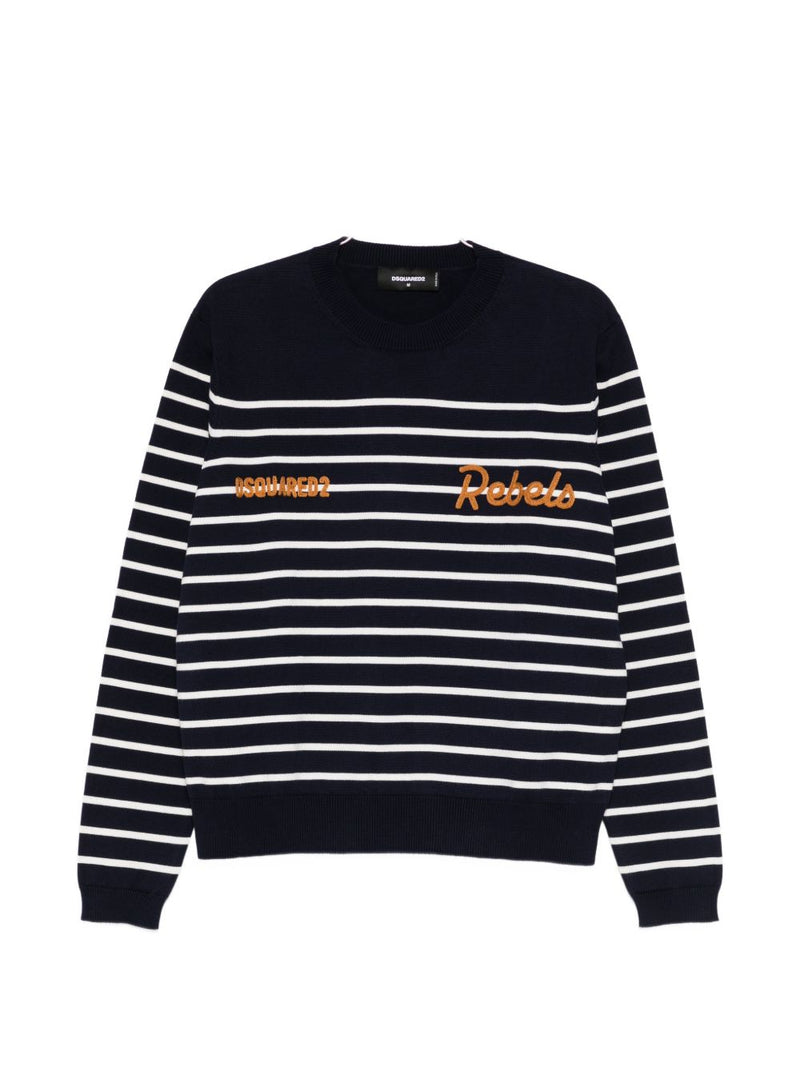 Lo striped embroidered sweater di Dsquared2 unisce eleganza rilassata e dettagli distintivi in un capo dal carattere sofisticato. Proposto in blu, si caratterizza per il design a righe arricchito da dettagli ricamati, che aggiungono profondità e personalità alla maglieria.