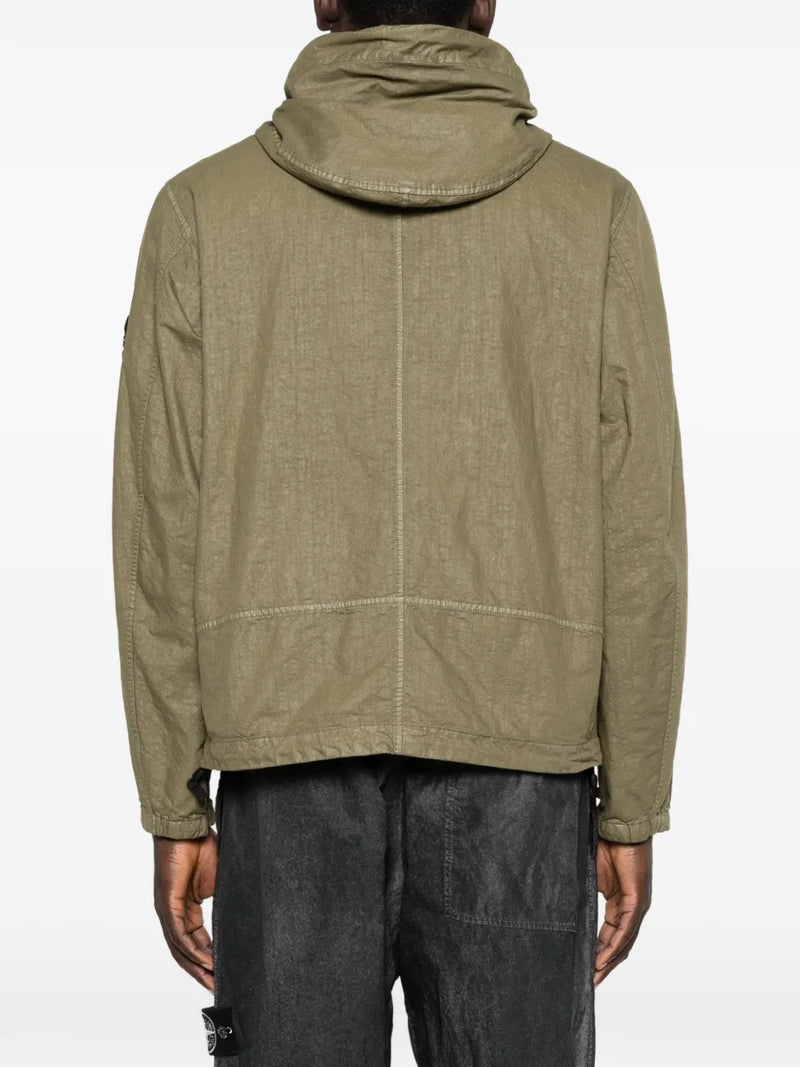 Iconica e funzionale, la giacca con cappuccio Stone Island in colore verde militare esprime perfettamente l’estetica tecnica e contemporanea del brand.