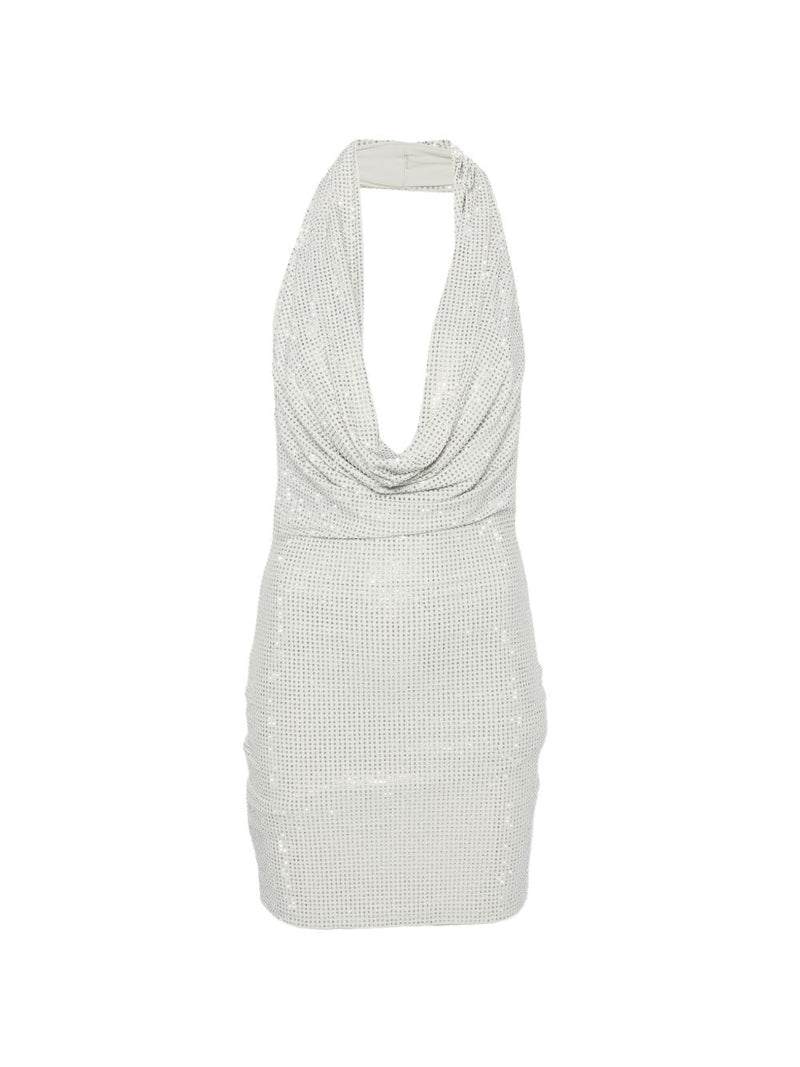 L'abito argento di twentyfourhaitch è un modello corto dal design essenziale e luminoso, caratterizzato da una superficie interamente decorata che valorizza la silhouette. La scollatura profonda con drappeggio frontale e il collo all'americana mettono in risalto la parte superiore del corpo con un effetto elegante e contemporaneo.