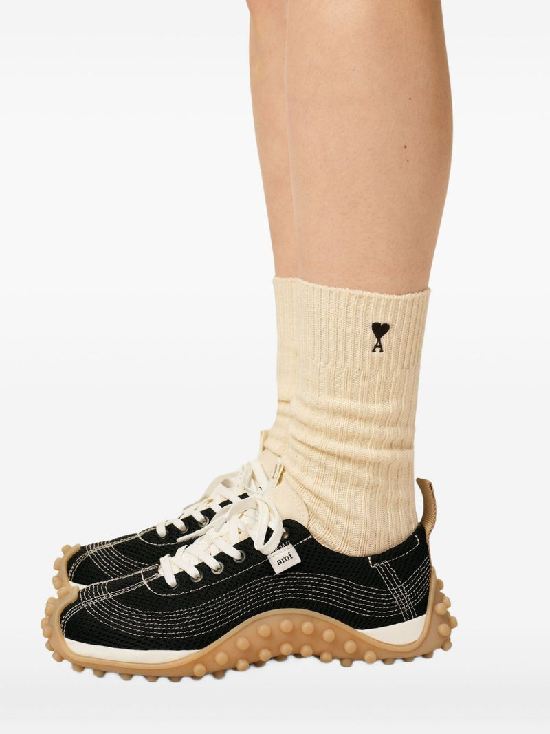 Il logo Ami de Coeur ricamato in nero impreziosisce ciascun paio con un tocco iconico. Il set include tre varianti di colore – nero profondo, grigio melange e bianco panna – pensate per adattarsi facilmente a ogni tipo di outfit, dal casual al più ricercato.