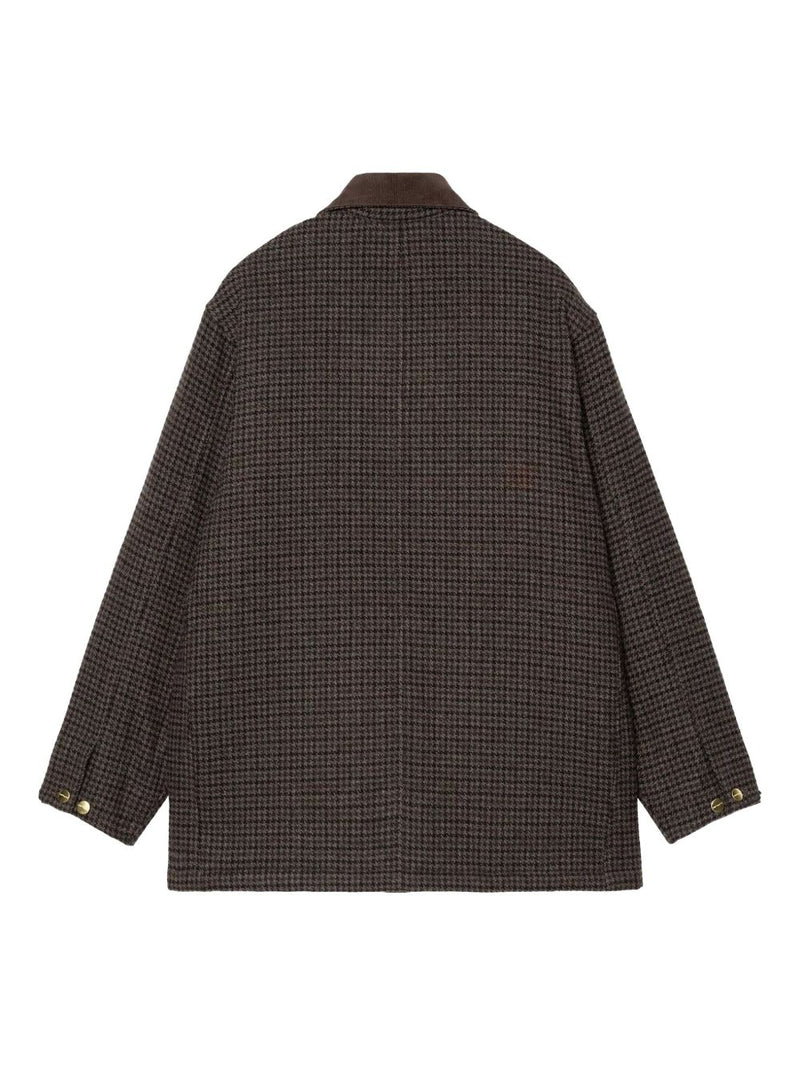 Presentato nella tonalità marrone, si distingue per il caratteristico motivo a quadri, un dettaglio che dona profondità e stile al design. Il colletto a coste aggiunge texture e contrasto, mentre la chiusura monopetto a bottoni e le tasche frontali completano un capo versatile e funzionale, ideale per outfit urbani e casual-eleganti.
