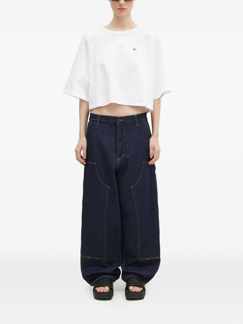 Il design include tasche utility ispirate all’abbigliamento da lavoro, cuciture rinforzate e una patch logo Carhartt WIP con fondo bianco e logo nero, che spicca sulla tasca posteriore. Perfetti da indossare con crop top, felpe oversize o camicie per uno stile streetwear moderno. Un must-have per chi cerca carattere e comfort nel denim.