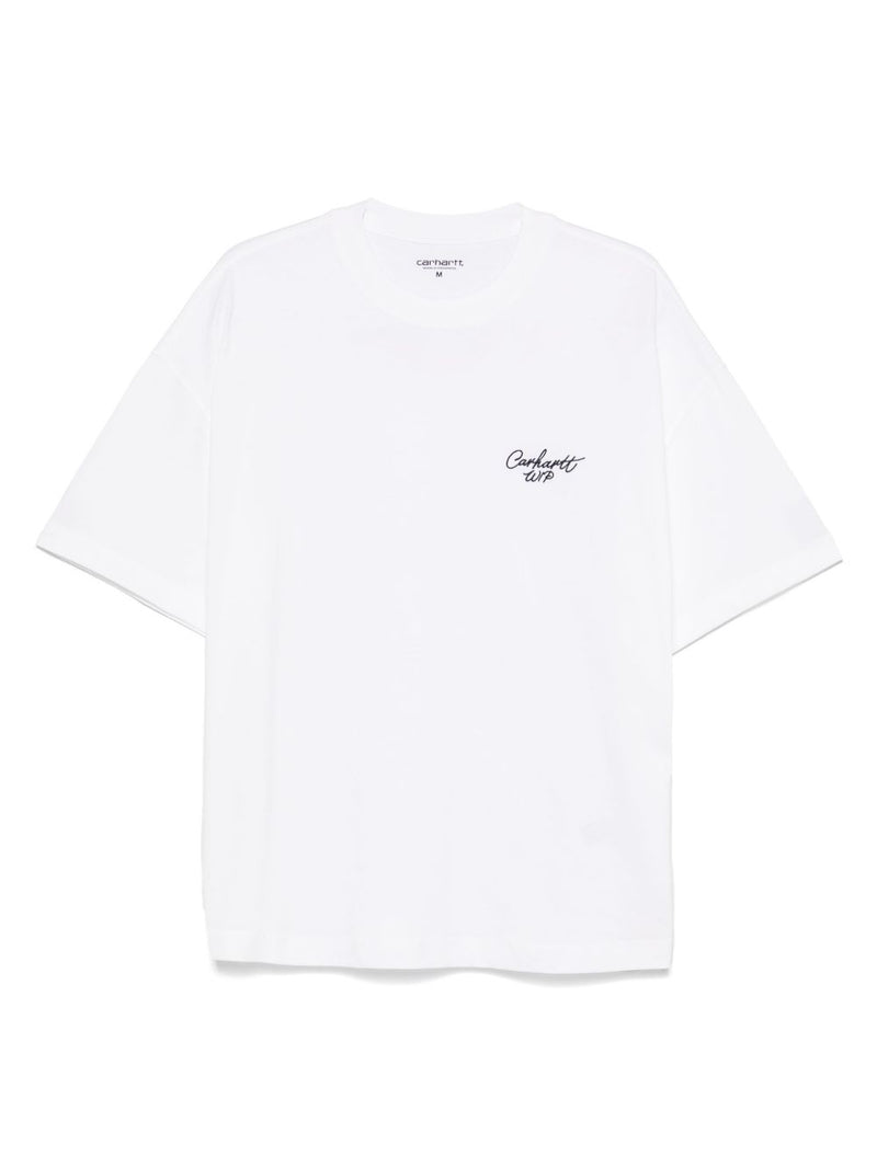 Proposta in bianco, presenta girocollo classico, maniche corte e il caratteristico logo Carhartt WIP Signature Script stampato sul petto, per un tocco distintivo e contemporaneo. Un modello versatile, perfetto per completare look casual e streetwear.