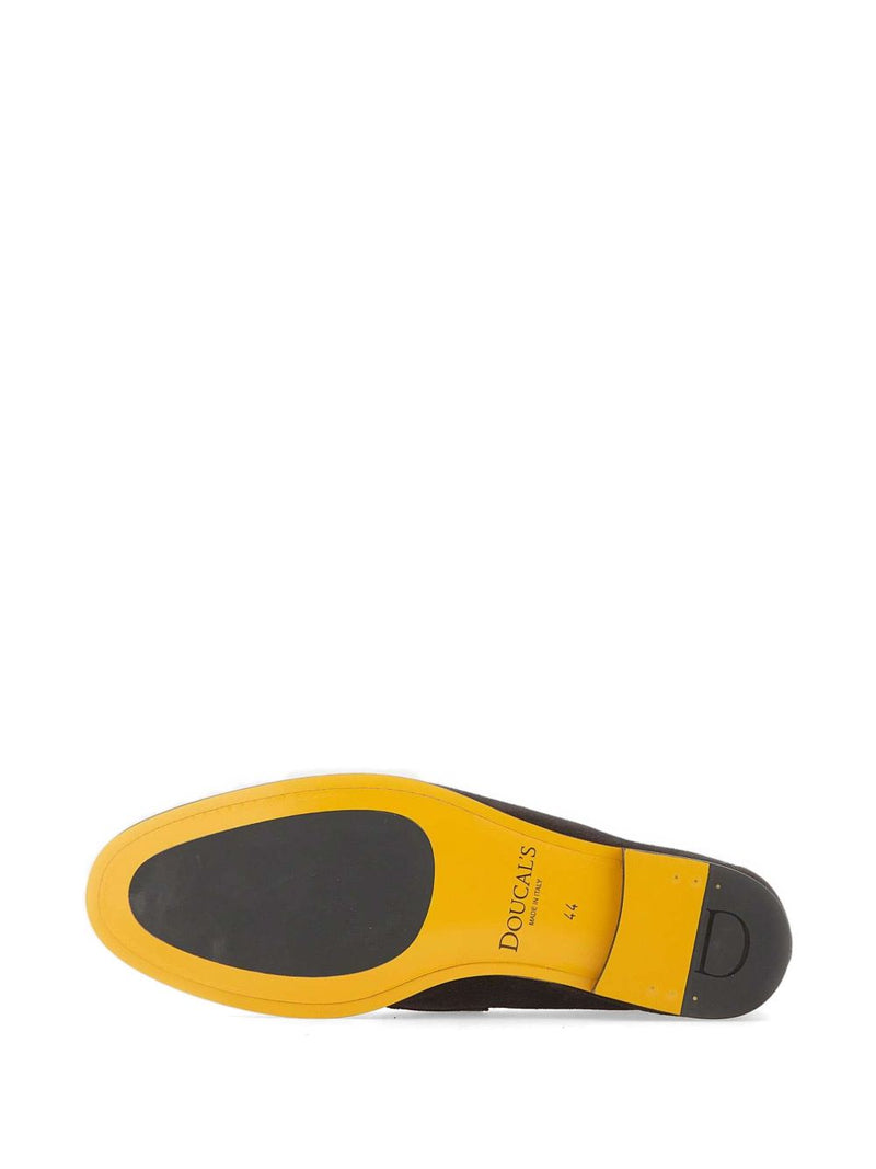 I mocassini Doucal's con fibbia reinterpretano il classico stile da barca con una raffinata eleganza urbana. La tomaia in 100% pelle scamosciata di vitello nella tonalità marrone testa di moro offre una texture vellutata e una morbidezza immediata, valorizzata dal cinturino con fibbia metallica che dona un tocco sartoriale.