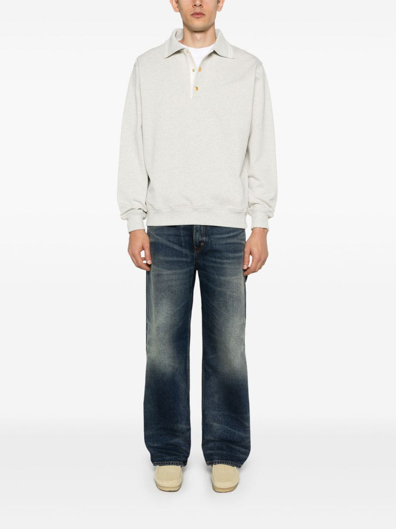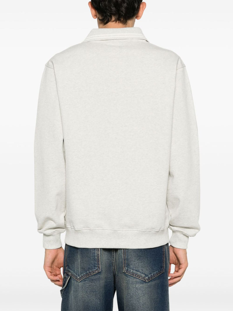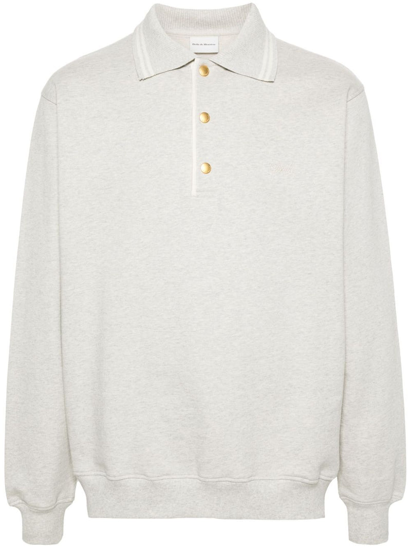 Proposto in grigio chiaro effetto mélange, presenta colletto stile polo con chiusura frontale a pressione, maniche lunghe e orlo dritto con finiture a coste. Il dettaglio a righe e il logo ricamato sul petto completano il design con un tocco iconico e rilassato, perfettamente in linea con l’estetica di Drôle De Monsieur.