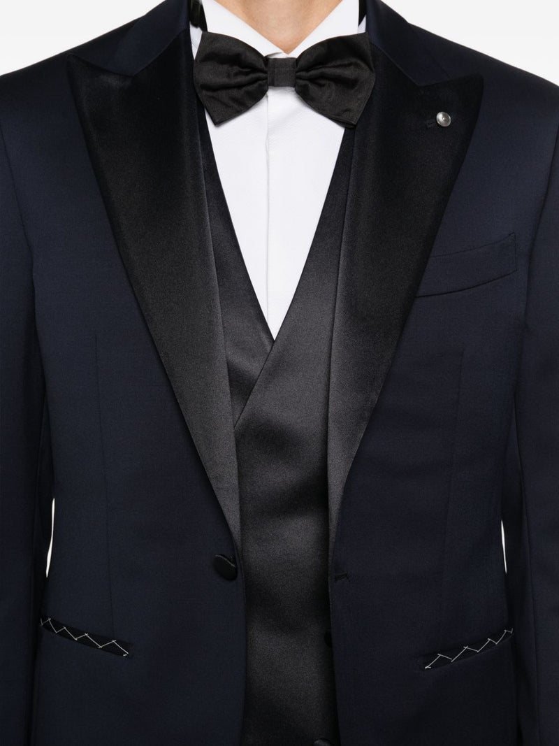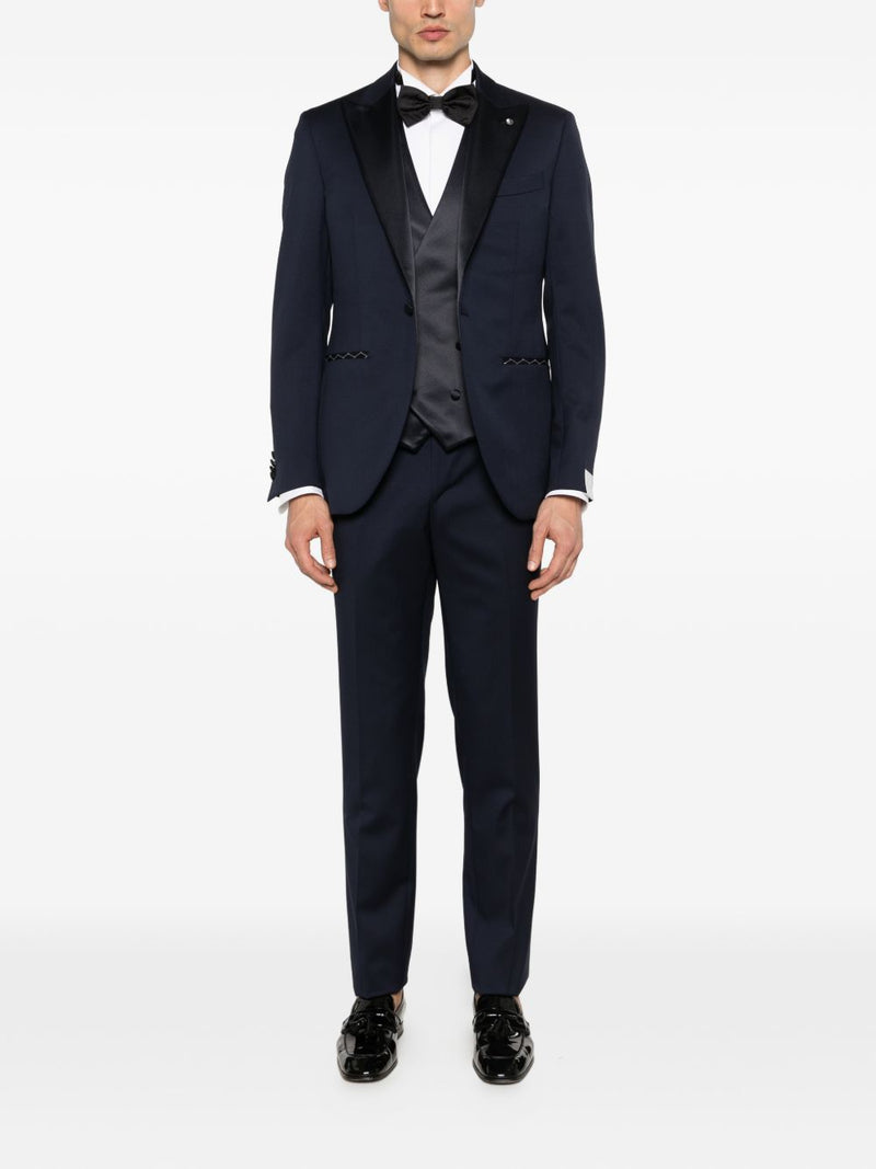 L’abito uomo Luigi Bianchi si distingue per un design elegante e contemporaneo, ideale per cerimonie e occasioni formali. Il modello presenta una giacca con revers a lancia in tessuto lucido a contrasto e chiusura a due bottoni, arricchita da dettagli sartoriali che valorizzano la linea.