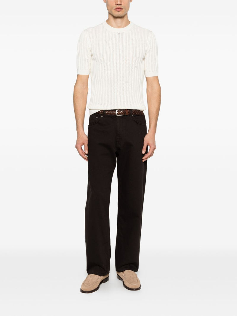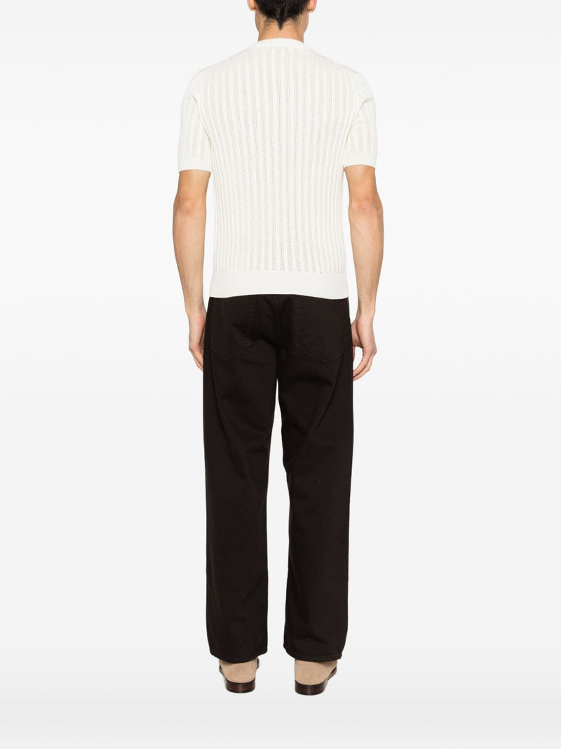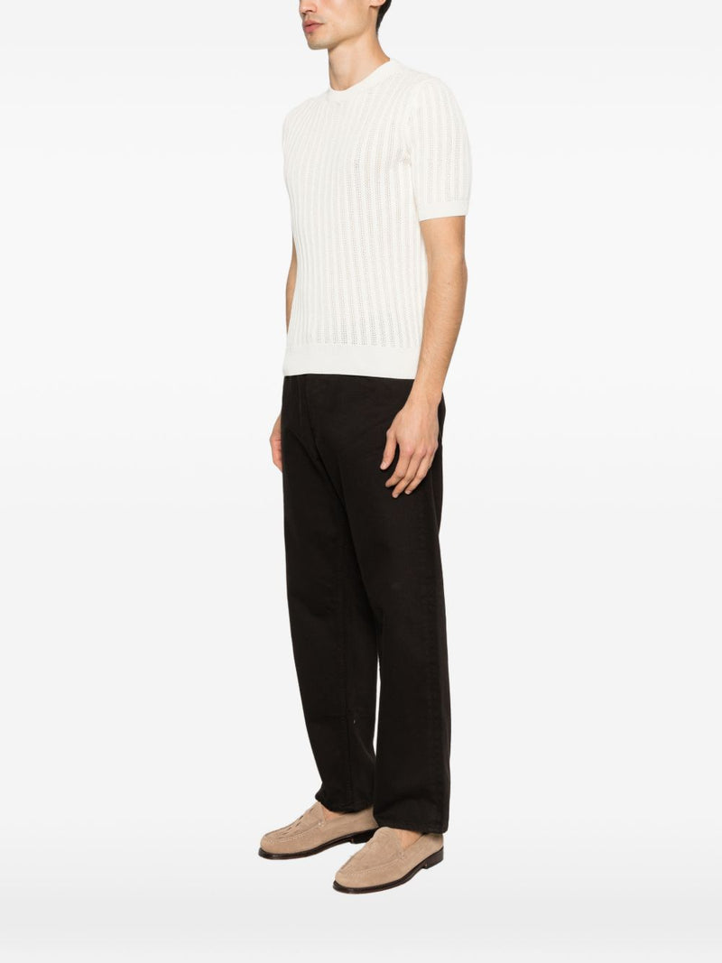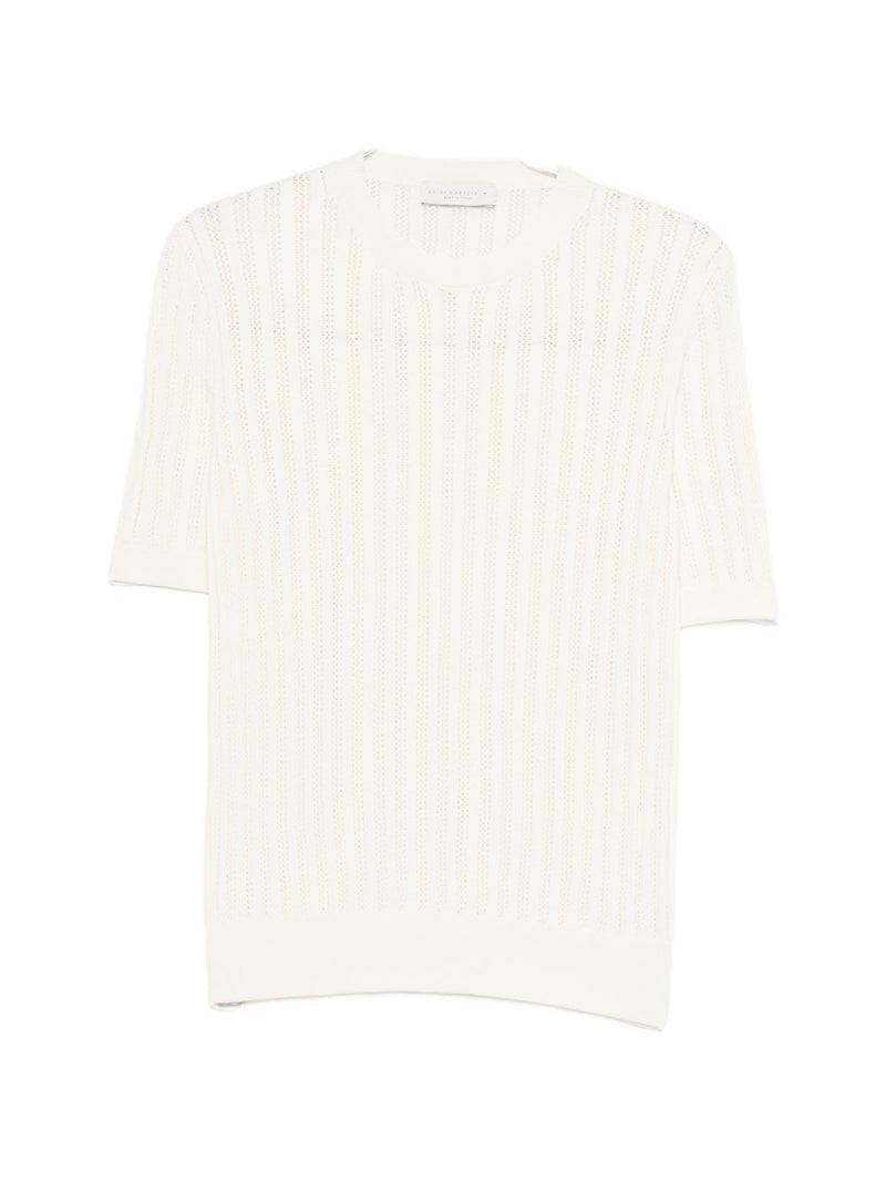 La maglia Luigi Gentile da uomo in tonalità beige chiaro si distingue per il design traforato a righe verticali, che dona leggerezza e un aspetto raffinato. Il modello a mezza manica con collo tondo presenta bordi a coste su collo, fondo e maniche per una finitura pulita e curata.