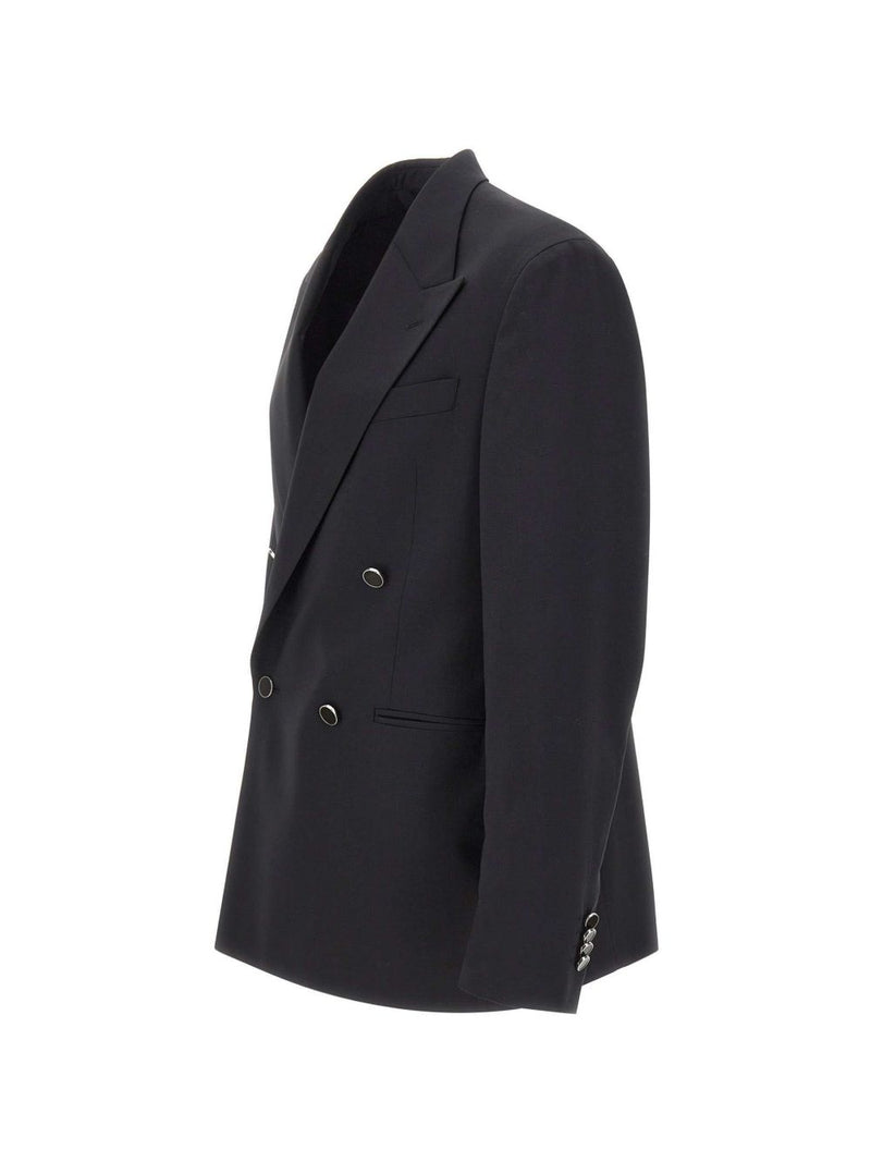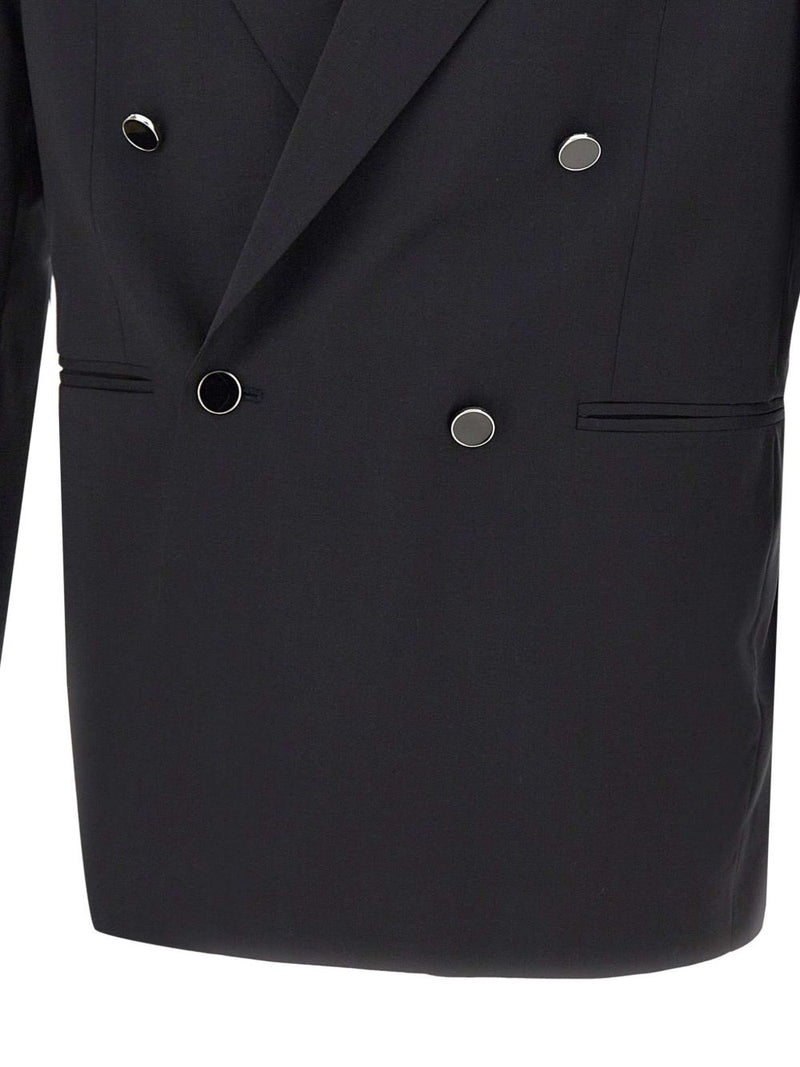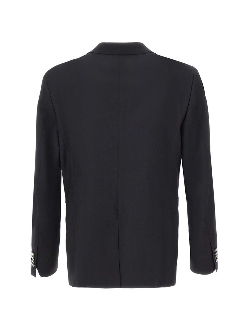 - Chiusura/Tasche: abbottonatura doppiopetto con bottoni frontali e tasche laterali a filetto
