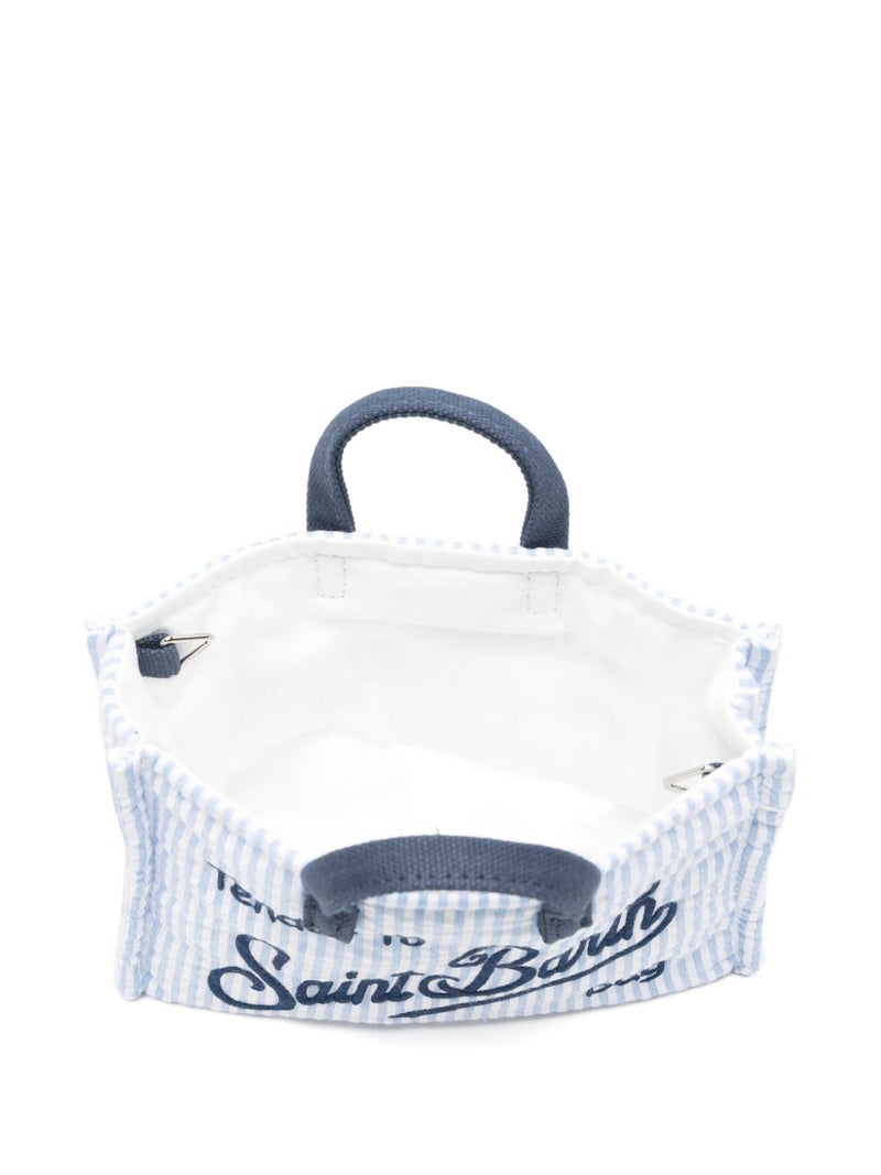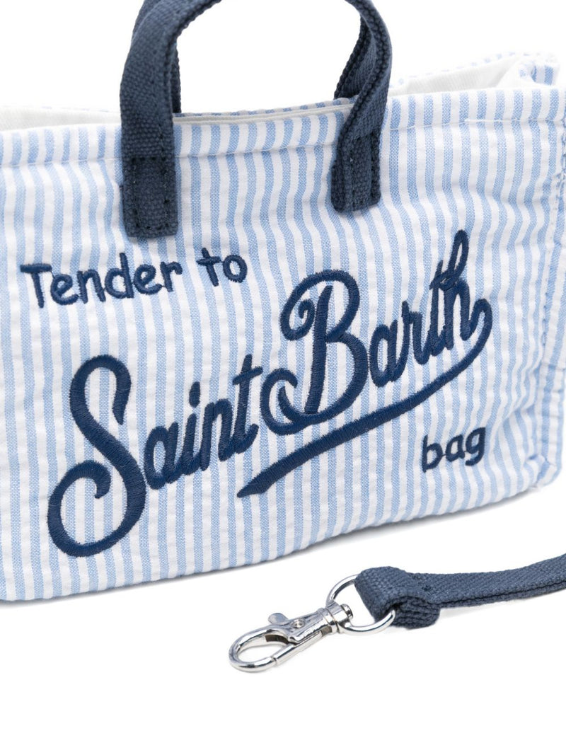 La pochette mc2 saint barth unisce stile estivo e praticità quotidiana in un accessorio compatto e leggero. Il design a righe verticali azzurre e bianche è valorizzato dal maxi logo ricamato "Saint Barth" sul fronte, per un tocco distintivo e riconoscibile.