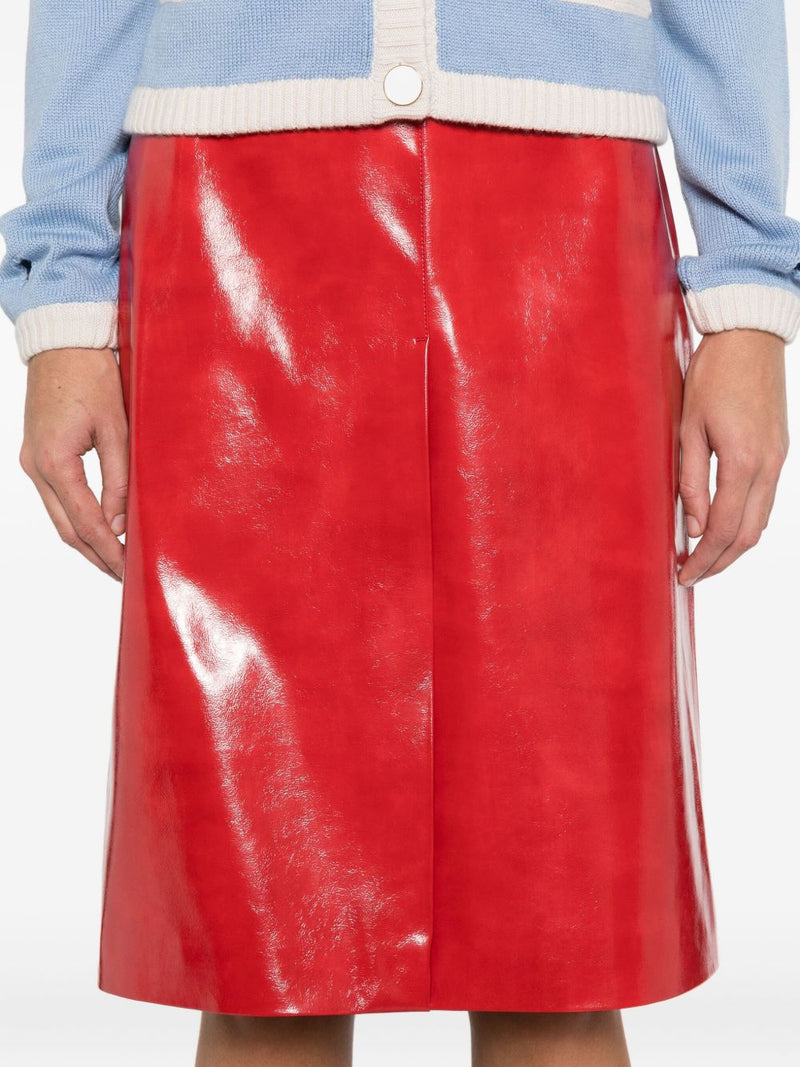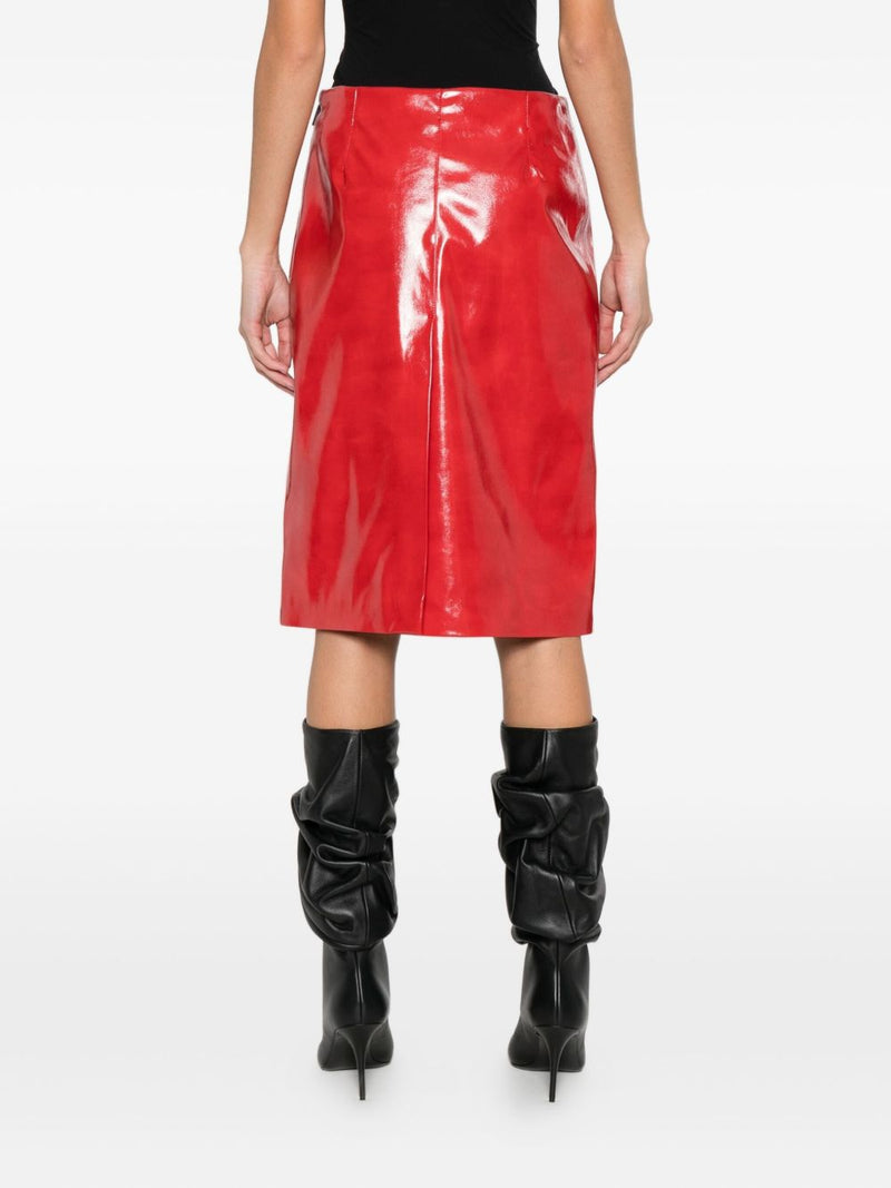 Proposta in rosso, si distingue per la vita alta che slancia la figura e per lo spacco posteriore, che aggiunge un tocco sensuale e contemporaneo. La chiusura laterale con zip completa un modello versatile e di forte impatto, perfetto per creare look femminili dal fascino urbano Made in Italy.