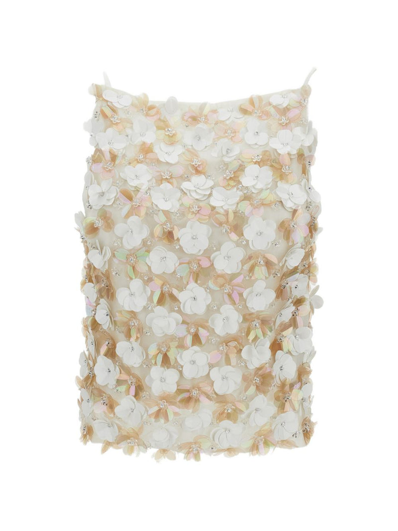 La blusa bianca da donna parosh si distingue per il suo design ricercato e femminile. Il modello presenta una base chiara impreziosita da applicazioni floreali tridimensionali tono su tono e iridescenti, che creano un effetto luminoso e sofisticato.