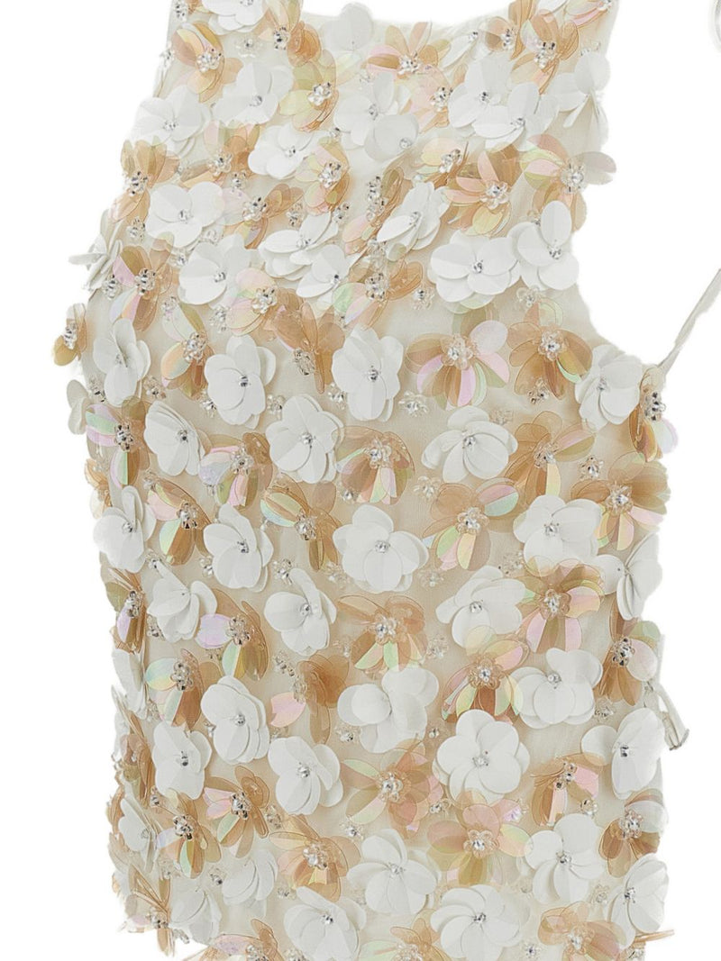 - Materiali: Tessuto leggero con ricamo di fiori tridimensionali e dettagli iridescenti