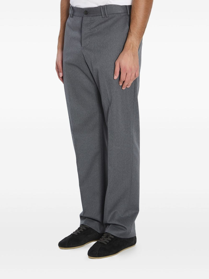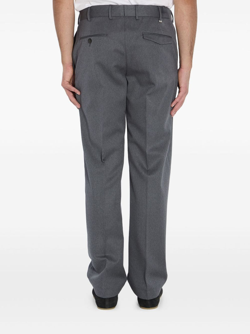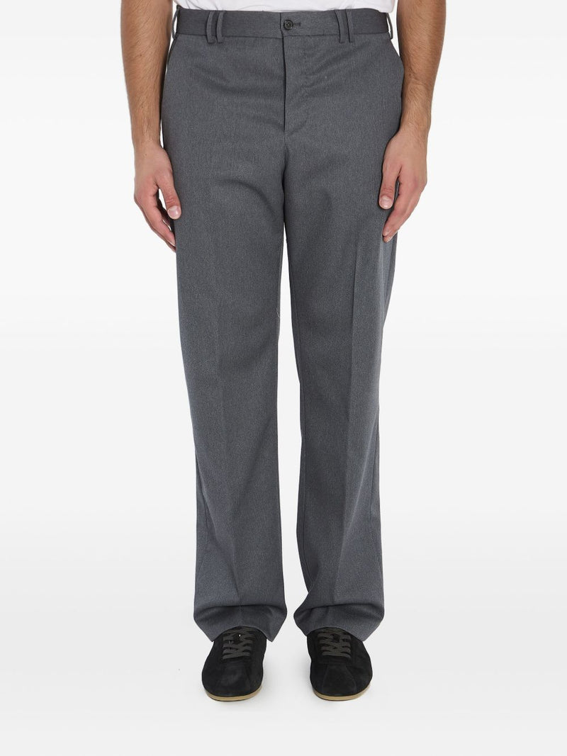 Proposti in grigio, presentano passanti per cintura, chiusura frontale con bottoni, tasche laterali e tasche posteriori con patta e bottoni, dettagli che riflettono l’attenzione artigianale e lo stile distintivo del brand.