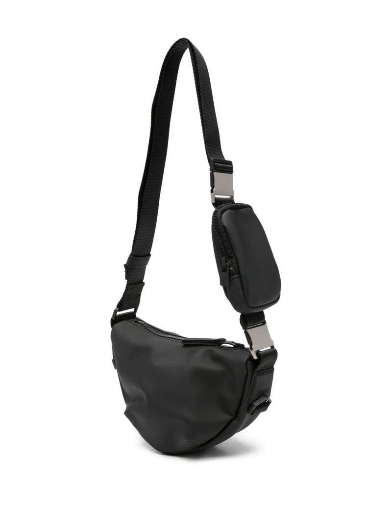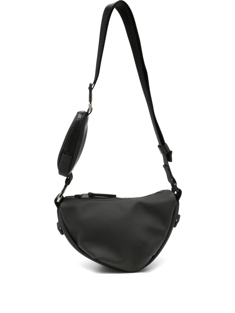 Proposta in nero, presenta una forma curva con chiusura superiore con zip, tracolla regolabile e una pouch coordinata con zip per riporre in sicurezza gli oggetti più piccoli. Un accessorio compatto e funzionale, perfetto per accompagnare i look urbani con un tocco moderno.