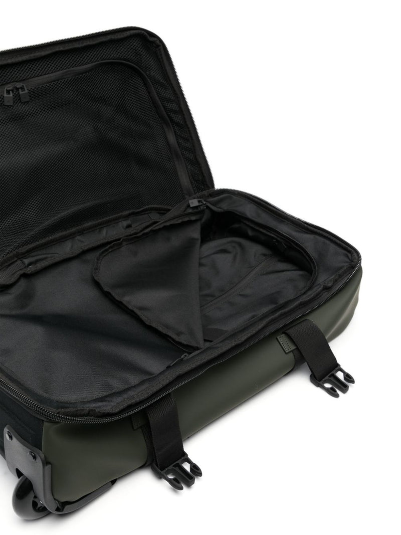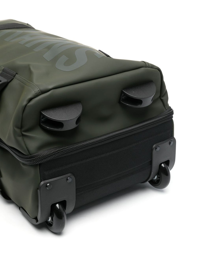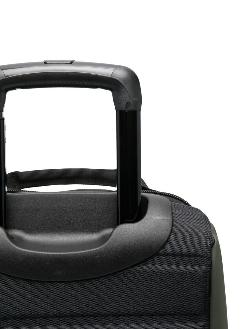 Proposta in verde scuro, presenta stampa con logo frontale, manico piatto superiore e laterale, manico allungabile e due ruote per un trasporto fluido e confortevole. La chiusura con zip a giro, le fasce elasticizzate e la chiusura con fibbia assicurano sicurezza e praticità, mentre lo scomparto interno diviso con tasche interne con zip permette di organizzare con ordine ogni viaggio.