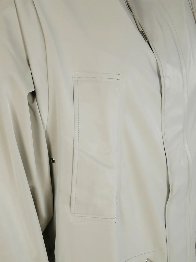 Proposto in beige, presenta cappuccio regolabile con coulisse, chiusura frontale nascosta e tasche laterali con zip per garantire praticità e protezione. Le maniche lunghe e la linea allungata donano una silhouette pulita e sofisticata, tipica dello stile urbano firmato Rains.