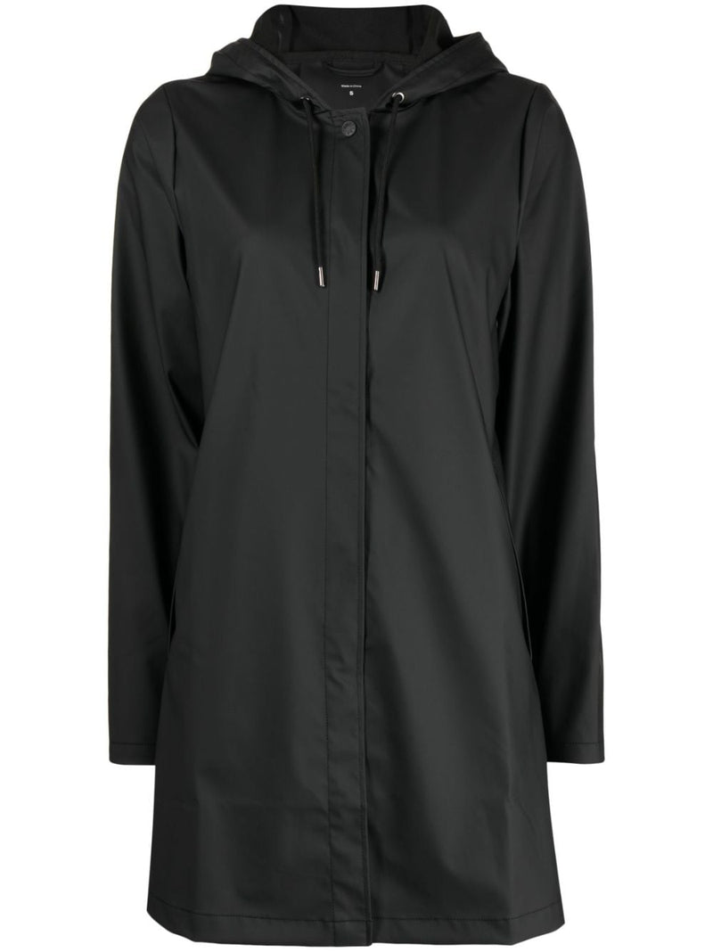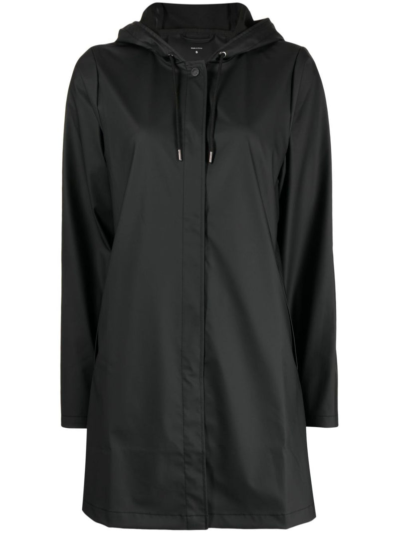 Proposto in nero, presenta un design svasato con cappuccio regolabile tramite coulisse, chiusura frontale nascosta con bottoni a pressione e polsini regolabili. Le due tasche laterali a filetto e la mini targhetta con logo completano un look essenziale e funzionale, ideale per la città o il viaggio.