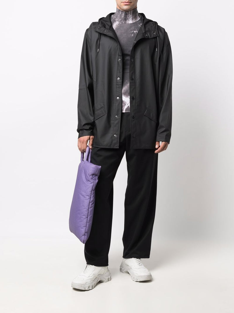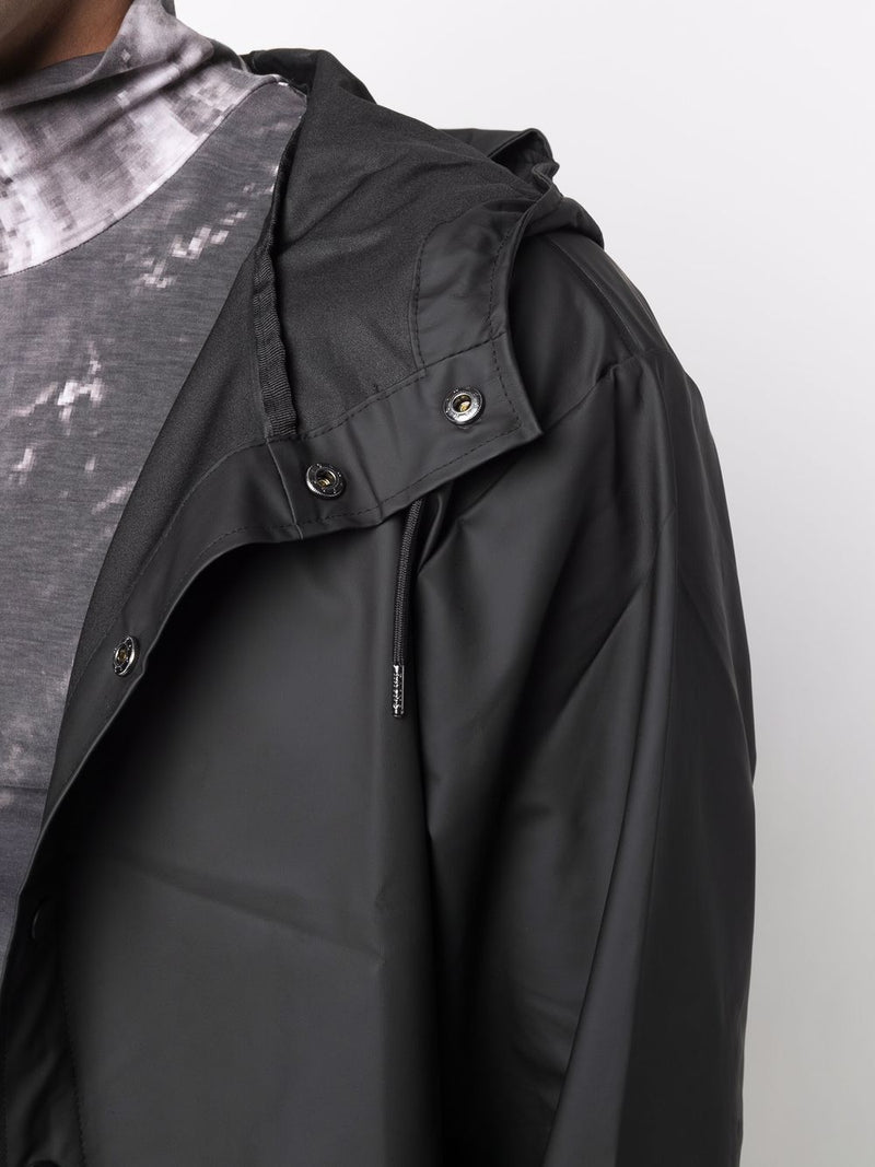 Proposta in nero, presenta collo alto, cappuccio con coulisse regolabile e pattina frangivento per la massima protezione dagli agenti atmosferici. La chiusura con bottoni a pressione, le tasche frontali con patta e l’orlo posteriore curvo completano un design pratico e contemporaneo.