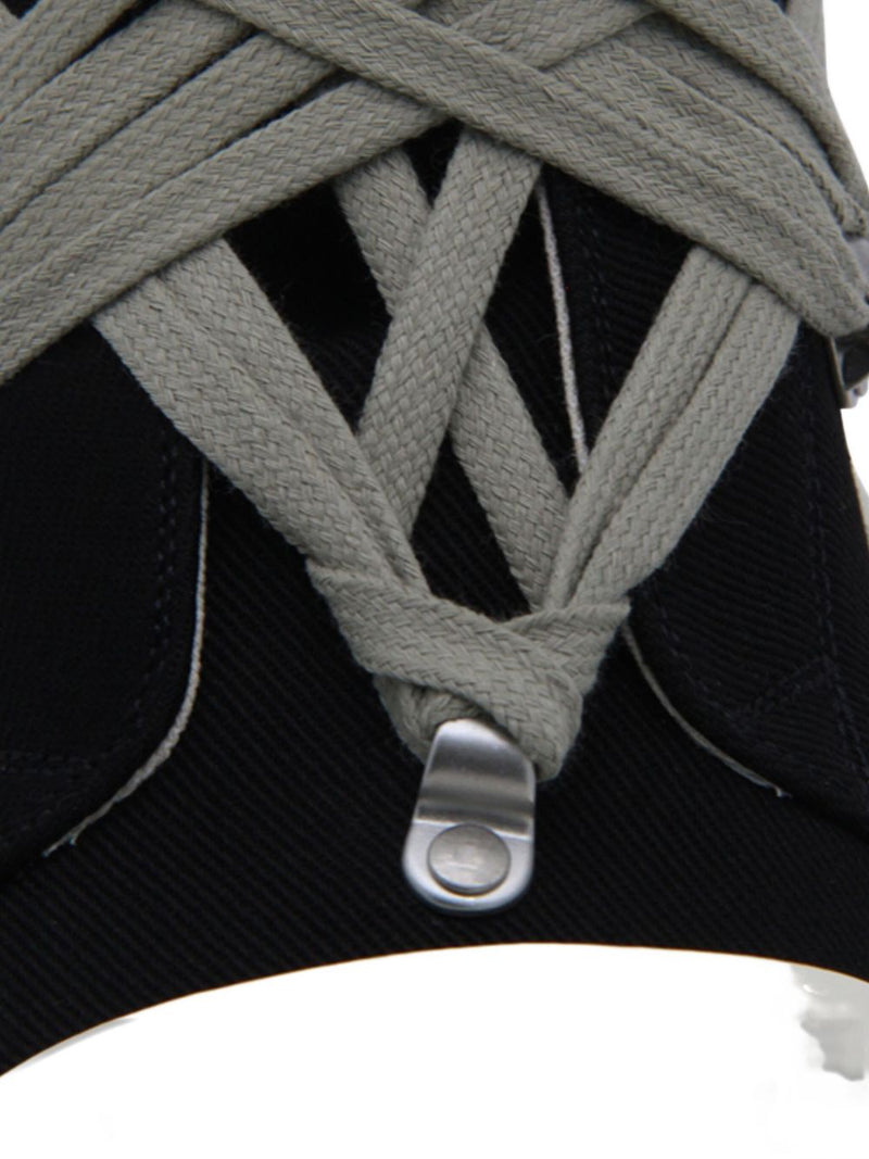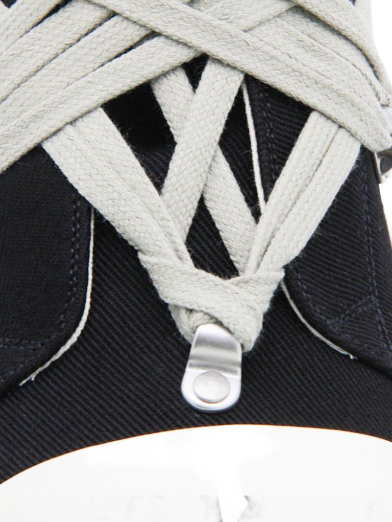Proposte in un profondo nero, presentano una chiusura frontale con lacci, occhielli in metallo e una suola piatta in gomma, elementi che rendono questa sneaker un must-have per chi ama lo stile contemporaneo e non convenzionale. Il design alto conferisce carattere e slancia la silhouette, mantenendo al tempo stesso la calzatura versatile e adatta a ogni look streetwear.