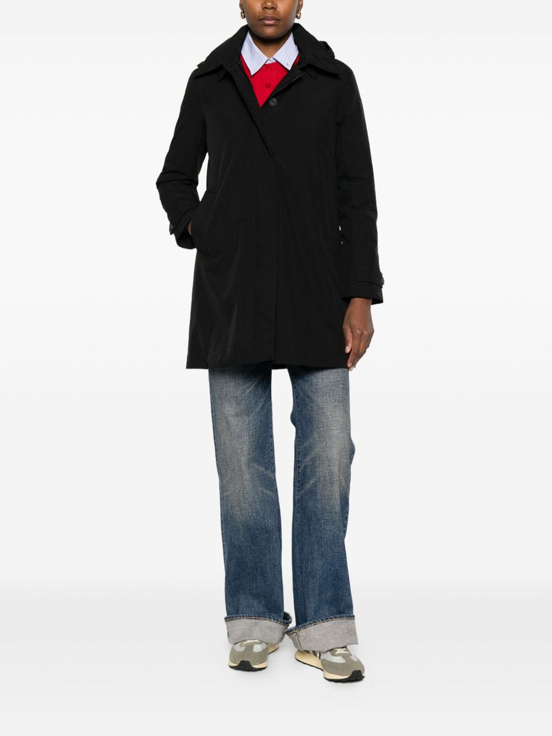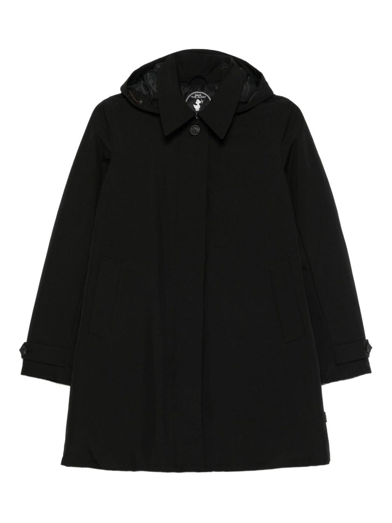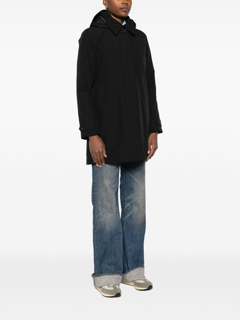 Proposto in nero, presenta uno scollo con cappuccio, una chiusura frontale con bottoni, maniche lunghe con polsini regolabili e una tasca laterale a filetto per la massima praticità. Il design essenziale e moderno lo rende un capo versatile, perfetto sia per la vita quotidiana che per occasioni più curate.